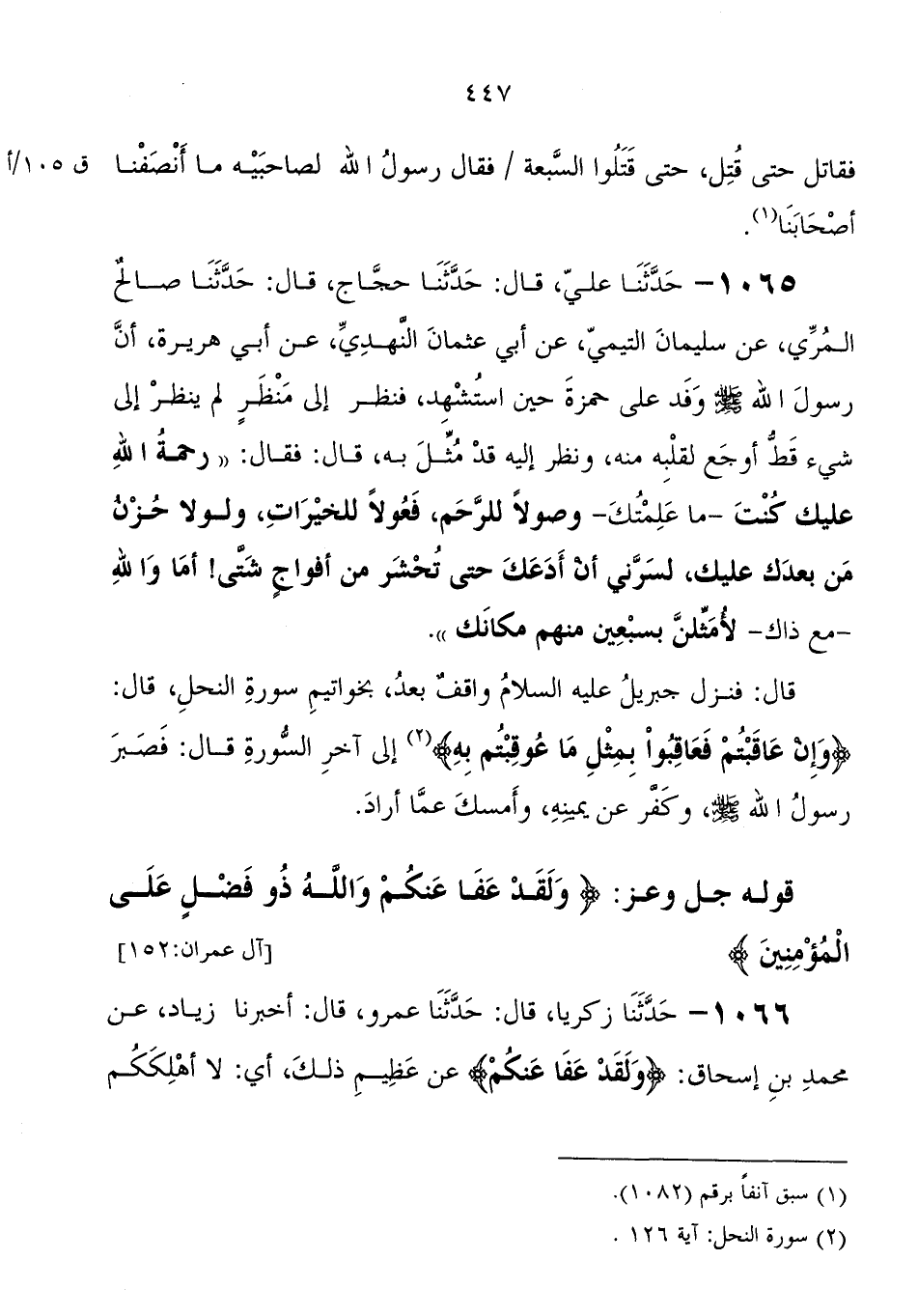 1065 - حَدَّثَنَا عَلِيٌّ، قَالَ: حَدَّثَنَا حَجَّاجٌ، قَالَ: حَدَّثَنَا صَالِحٌ الْمُرِّيُّ، عَنْ سُلَيْمَانَ التَّيْمِيِّ، عَنْ أَبِي عُثْمَانَ النَّهْدِيِّ، عَنْ أَبِي هُرَيْرَةَ، أَنَّ رَسُولَ اللهِ صَلَّى اللَّهُ عَلَيْهِ وَسَلَّمَ وَفِدَ عَلَى حَمْزَةَ حِينَ اسْتُشْهِدَ، فَنَظَرَ إِلَى مَنْظَرٍ لَمْ يَنْظُرْ إِلَى شَيْءٍ قَطُّ أَوْجَعُ لِقَلْبِهِ مِنْهُ، وَنَظَرَ إِلَيْهِ قَدْ مُثِّلَ بِهِ، قَالَ: فَقَالَ: " رَحْمَةُ اللهُ عَلَيْكَ، كُنْتَ، مَا عَلِمْتُكَ، وَصُولا لِلرَّحِمِ، فَعُولا لِلْخَيْرَاتِ، وَلَوْلا حُزْنُ مَنْ بَعْدَكَ عَلَيْكَ، لَسَرَّنِي أَنْ أَدَعَكَ حَتَّى تُحْشَرَ مِنْ أَفْوَاجٍ شَتَّى، أَمَا وَاللهِ، مَعَ ذَاكَ، لأُمَثِّلَنَّ بِسَبْعِينَ مِنْهُمْ مَكَانَكَ " قَالَ: فَنَزَلَ جِبْرِيلُ عَلَيْهِ السَّلامُ وَاقِفًا بَعْدُ، بِخَوَاتِيمِ سُورَةِ النَّحْلِ، قَالَ: {وَإِنْ عَاقَبْتُمْ فَعَاقِبُوا بِمِثْلِ مَا عُوقِبْتُمْ بِهِ} إِلَى آخِرِ السُّورَةِ قَالَ: فَصَبِرَ رَسُولُ اللهِ صَلَّى اللَّهُ عَلَيْهِ وَسَلَّمَ، وَكَفَّرَ عَنْ يَمِينِهِ، وَأَمْسَكَ عَمَّا أَرَادَ قوله عَزَّ وَجَلَّ: {وَلَقَدْ عَفَا عَنْكُمْ وَاللهُ ذُو فَضْلٍ عَلَى الْمُؤْمِنِينَ}