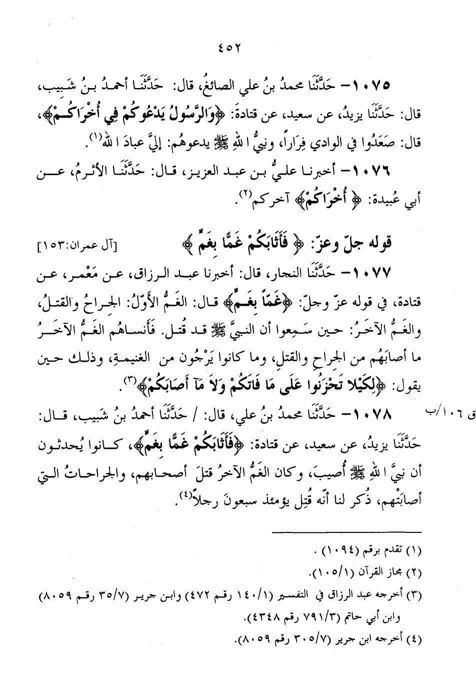 1077 - حَدَّثَنَا النجار، قَالَ: أَخْبَرَنَا عَبْد الرزاق، عَنْ معمر، عَنْ قتادة، فِي قوله عَزَّ وَجَلَّ: {غَمًّا بِغَمٍّ} قَالَ " الغم الأول: الجراح والقتل، والغم الآخر: حين سمعوا أن النَّبِيّ صَلَّى اللَّهُ عَلَيْهِ وَسَلَّمَ قد قتل: فأنساهم الغم الآخر مَا أصابهم من الجراح والقتل، وما كَانُوا يرجون من الغنيمة، وذلك حين يَقُول: {لِكَيْلا تَحْزَنُوا عَلَى مَا فَاتَكُمْ وَلا مَا أَصَابَكُمْ} "