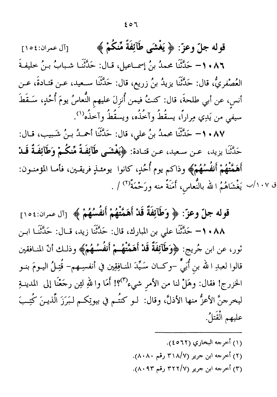 1088 - حَدَّثَنَا عَلِيُّ بْنُ الْمُبَارَكِ، قَالَ: حَدَّثَنَا زَيْدٌ، قَالَ: حَدَّثَنَا ابْنُ ثَوْرٍ، عَنِ ابْنِ جُرَيْجٍ: {وَطَائِفَةٌ قَدْ أَهَمَّتْهُمْ أَنْفُسُهُمْ} " وذلك أن المنافقين قَالُوا لعَبْد الله بْن أبي، وَكَانَ سيد المنافقين فِي أنفسهم: قتل اليوم بنو الخزرج، فَقَالَ: وهل لنا من الأمر شَيْء؟ أما والله لئن رجعنا إِلَى المدينة ليخرجن الأعز منها الأذل، وَقَالَ: لو كنتم فِي بيوتكم لبرز الَّذِينَ كتب عليهم القتل "