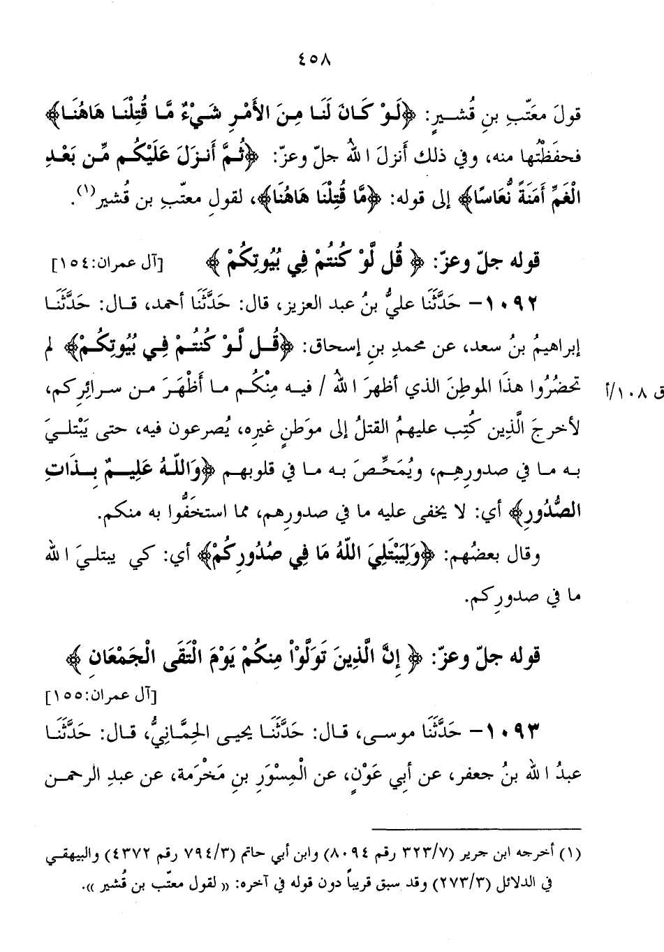 1092 - حَدَّثَنَا عَلِيُّ بْنُ عَبْدِ الْعَزِيزِ، قَالَ: حَدَّثَنَا أَحْمَدُ، قَالَ: حَدَّثَنَا إِبْرَاهِيمُ بْن سعد، عَنْ مُحَمَّد بْن إِسْحَاق " {قُلْ لَوْ كُنْتُمْ فِي بُيُوتِكُمْ} لم تحضروا هَذَا الموطن الَّذِي أظهر الله فيه منكم مَا أظهر من سرائركم، لأخرج الَّذِينَ كتب عليهم القتل إِلَى موطن غيره، يصرعون فيه، حَتَّى يبتلي به مَا فِي صدورهم، ويمحص به مَا فِي قلوبهم {وَاللهُ عَلِيمٌ بِذَاتِ الصُّدُورِ} أي: لا يخفى عَلَيْهِ مَا فِي صدورهم، مما استخفوا به منكم وَقَالَ بعضهم: {وَلِيَبْتَلِيَ اللهُ مَا فِي صُدُورِكُمْ} أي: كي يبتلي الله مَا فِي صدوركم "