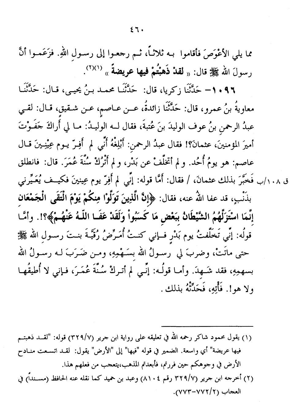 1096 - حَدَّثَنَا زَكَرِيَّا، قَالَ: حَدَّثَنَا مُحَمَّدُ بْنُ يَحْيَى، قَالَ: حَدَّثَنَا مُعَاوِيَةُ بْنُ عَمْرٍو، قَالَ: حَدَّثَنَا زَائِدَةُ، عَنْ عَاصِمٍ، عَنْ شَقِيقٍ، قَالَ: لَقِيَ عَبْدُ الرَّحْمَنِ بْنُ عَوْفٍ الْوَلِيدَ بْنَ عُتْبَةَ، فَقَالَ لَهُ الْوَلِيدُ: مَا لِي أَرَاكَ جَفَوْتَ أَمِيرَ الْمُؤْمِنِينَ، عُثْمَانَ فَقَالَ عَبْدُ الرَّحْمَنِ " أَبْلِغْهُ أَنِّي لَمْ أَفِرَّ يَوْمَ عَيْنَيْنِ " قَالَ عَاصِمٌ: هُوَ يَوْمُ أُحُدٍ وَلَمْ أَتَخَلَّفْ عَنْ بَدْرٍ، وَلَمْ أَتْرُكْ سُنَّةَ عُمَرَ " قَالَ: فَانْطَلَقَ فَخَبَّرَ بِذَلِكَ عُثْمَانَ، فَقَالَ: " أَمَّا قوله: إِنِّي لَمْ أَفِرَّ يَوْمَ عَيْنَيْنِ فَكِيَفْ يُعَيِّرُنِي بِذَنْبٍ، قَدْ عَفَا اللهُ عَنْهُ، فَقَالَ: {إِنَّ الَّذِينَ تَوَلَّوْا مِنْكُمْ يَوْمَ الْتَقَى الْجَمْعَانِ إِنَّمَا اسْتَزَلَّهُمُ الشَّيْطَانُ بِبَعْضِ مَا كَسَبُوا وَلَقَدْ عَفَا اللهُ عَنْهُمْ} ؟ وَأَمَّا قوله: إِنِّي تَخَلَّفْتُ يَوْمَ بَدْرٍ فَإِنِّي كُنْتُ أُمَرِّضُ رُقَيَّةَ بِنْتَ رَسُولِ اللهِ صَلَّى اللَّهُ عَلَيْهِ وَسَلَّمَ حَتَّى مَاتَتْ، وَضَرَبَ لِي رَسُولُ اللهِ بِسَهْمِهِ، وَمَنْ ضَرَبَ لَهُ رَسُولُ اللهِ صَلَّى اللَّهُ عَلَيْهِ وَسَلَّمَ بِسَهْمِهِ، فَقَدْ شَهِدَ وَأَمَّا قوله: إِنِّي لَمْ أَتْرُكْ سُنَّةَ عُمَرَ، فَإِنِّي لا أُطِيقُهَا وَلا هُوَ فَأْتِهِ فَحَدِّثْهُ بِذَلِكَ "