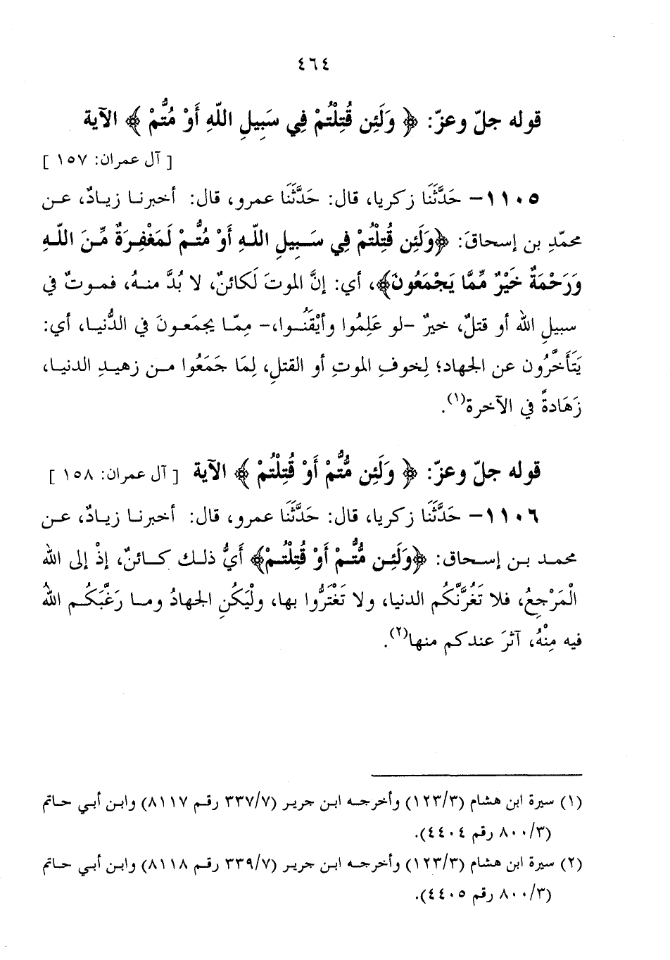 1105 - حَدَّثَنَا زكريا، قَالَ: حَدَّثَنَا عمرو، قَالَ: أَخْبَرَنَا زياد، عَنْ مُحَمَّد بْن إِسْحَاق: {وَلَئِنْ قُتِلْتُمْ فِي سَبِيلِ اللهِ أَوْ مُتُّمْ لَمَغْفِرَةٌ مِنَ اللهِ وَرَحْمَةٌ خَيْرٌ مِمَّا يَجْمَعُونَ} ، أي " إن الموت لكائن لا بد منه، فموت فِي سبيل الله أو قتل، خير، لو علموا وأيقنوا، مما يجمعون فِي الدنيا، أي: يتأخرون عَنِ الجهاد، لخوف الموت أو القتل، لما جمعوا من زهيد الدنيا، زهادة فِي الآخرة " قوله جَلَّ وَعَزَّ: {وَلَئِنْ مُتُّمْ أَوْ قُتِلْتُمْ} الآية