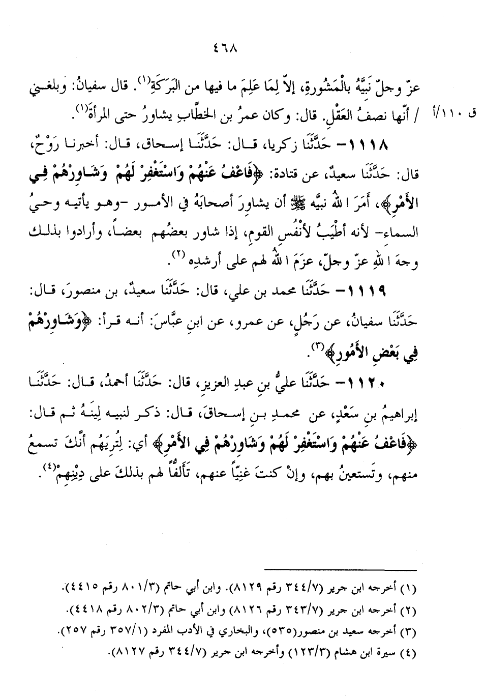 1118 - حَدَّثَنَا زكريا، قَالَ: حَدَّثَنَا إِسْحَاق، قَالَ: أَخْبَرَنَا روح، قَالَ: حَدَّثَنَا سعيد، عَنْ قتادة " {فَاعْفُ عَنْهُمْ وَاسْتَغْفِرْ لَهُمْ وَشَاوِرْهُمْ فِي الأَمْرِ} ، أمر الله نبيه صَلَّى اللَّهُ عَلَيْهِ وَسَلَّمَ أن يشاور أصحابه فِي الأمور، وَهُوَ يأتيه وحي السماء، لأنه أطيب لأنفس القوم، إذا شاور بعضهم بعضا، وأرادوا بِذَلِكَ وجه الله عَزَّ وَجَلَّ، عزم الله لهم عَلَى أرشده