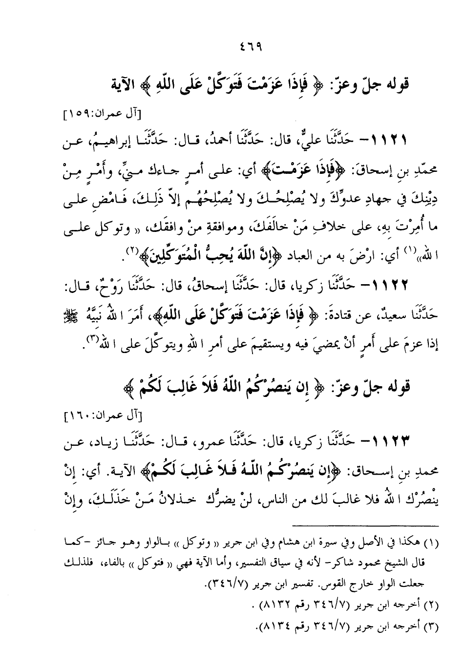 1121 - حَدَّثَنَا علي، قَالَ: حَدَّثَنَا أَحْمَدُ، قَالَ: حَدَّثَنَا إِبْرَاهِيمُ، عَنْ مُحَمَّد بْن إِسْحَاق " {فَإِذَا عَزَمْتَ} أي: عَلَى أمر جاءك مني، وأمر من دينك فِي جهاد عدوك ولا يصلحك ولا يصلحهم إِلا ذَلِكَ، فامض عَلَى مَا أمرت به، عَلَى خلاف من خالفك وموافقة من وافقك، وتوكل عَلَى الله أي: ارض به من العباد {إِنَّ اللهَ يُحِبُّ الْمُتَوَكِّلِينَ} "