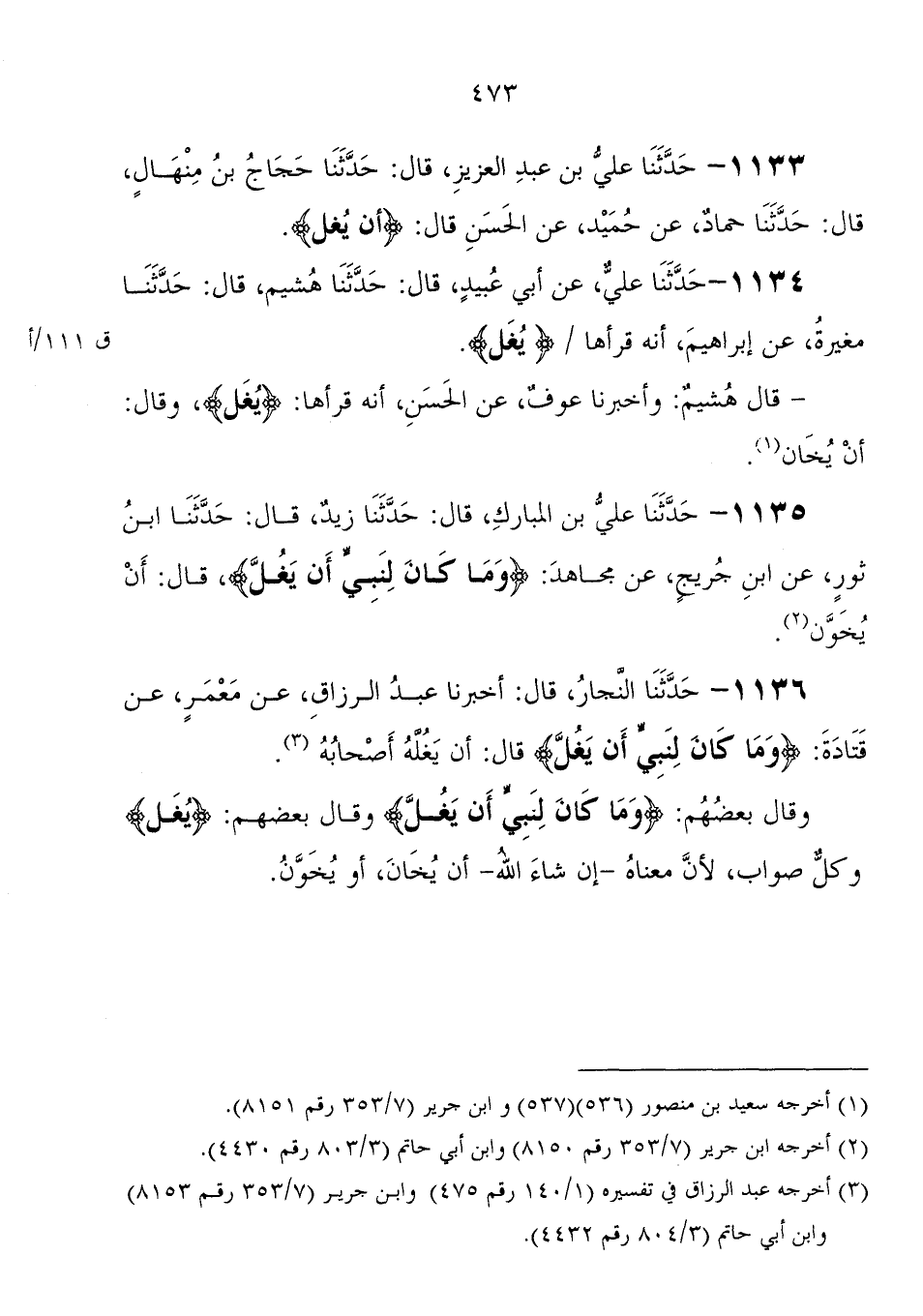 1134 - حَدَّثَنَا علي، عَنْ أبي عبيد، قَالَ: حَدَّثَنَا هشيم، قَالَ: حَدَّثَنَا مغيرة، عَنْ إبراهيم أنه قرأها: " يغل " قَالَ هشيم: وأخبرنا عوف، عَنِ الحسن، أنه قرأها: " يغل "، وَقَالَ: أن يخان