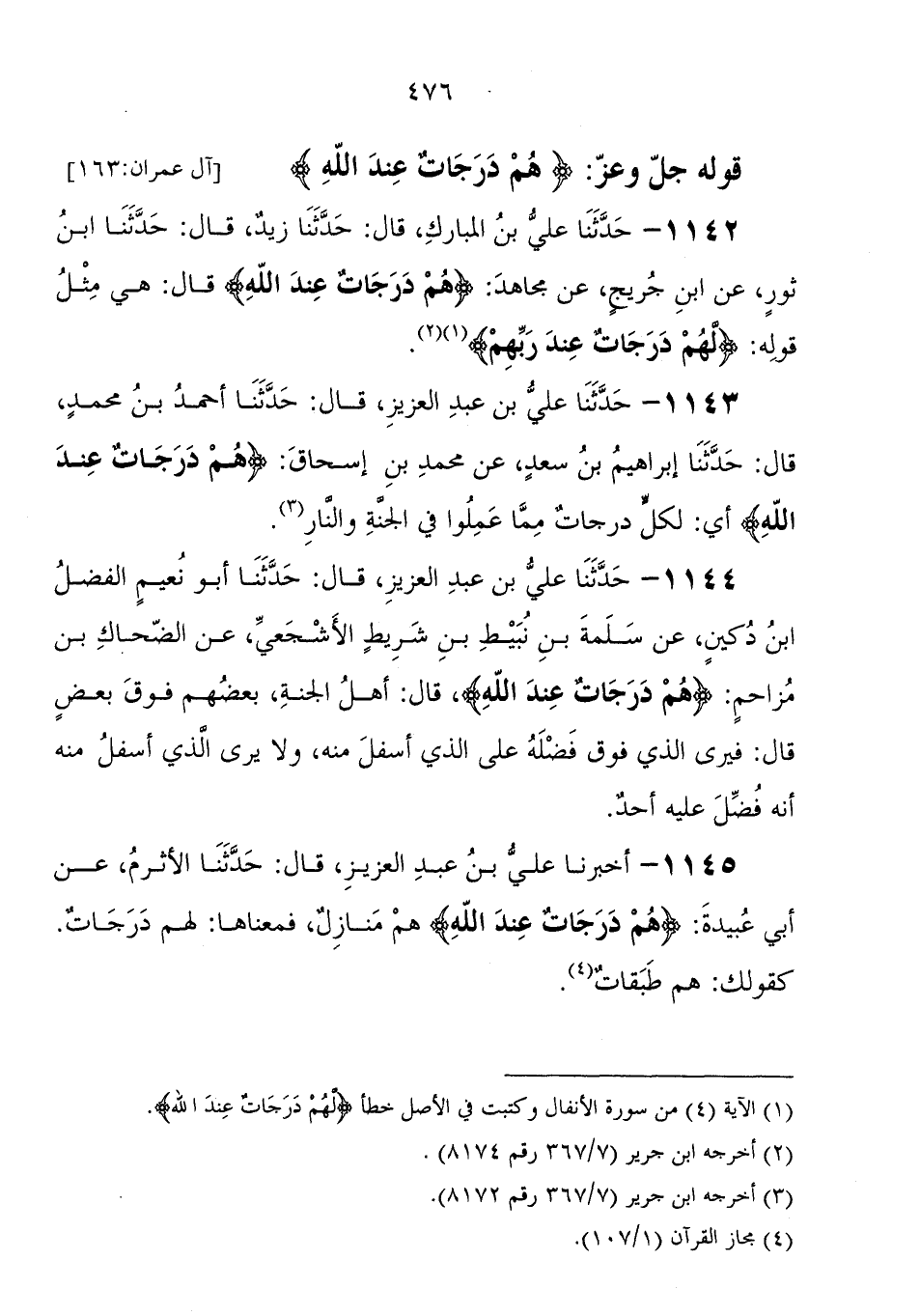 1145 - أَخْبَرَنَا علي بْن عَبْدِ العزيز، قَالَ: حَدَّثَنَا الأثرم، عَنْ أبي عبيدة: هُمْ دَرَجَاتٌ عِنْدَ اللهِ هم منازل، فمعناها: لهم درجات كقولك: هم طبقات "