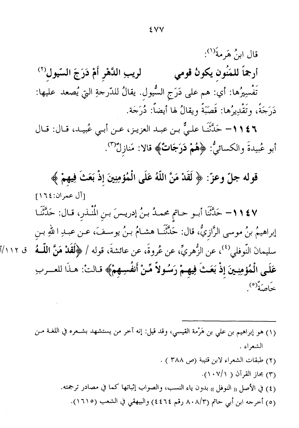 1146 - حَدَّثَنَا علي بْن عَبْدِ العزيز، عَنْ أبي عبيد، قَالَ: قَالَ أَبُو عبيدة والكسائي " هُمْ دَرَجَاتٌ قالا: منازل " قوله جَلَّ وَعَزَّ: {لَقَدْ مَنَّ اللهُ عَلَى الْمُؤْمِنِينَ إِذْ بَعَثَ فِيهِمْ}