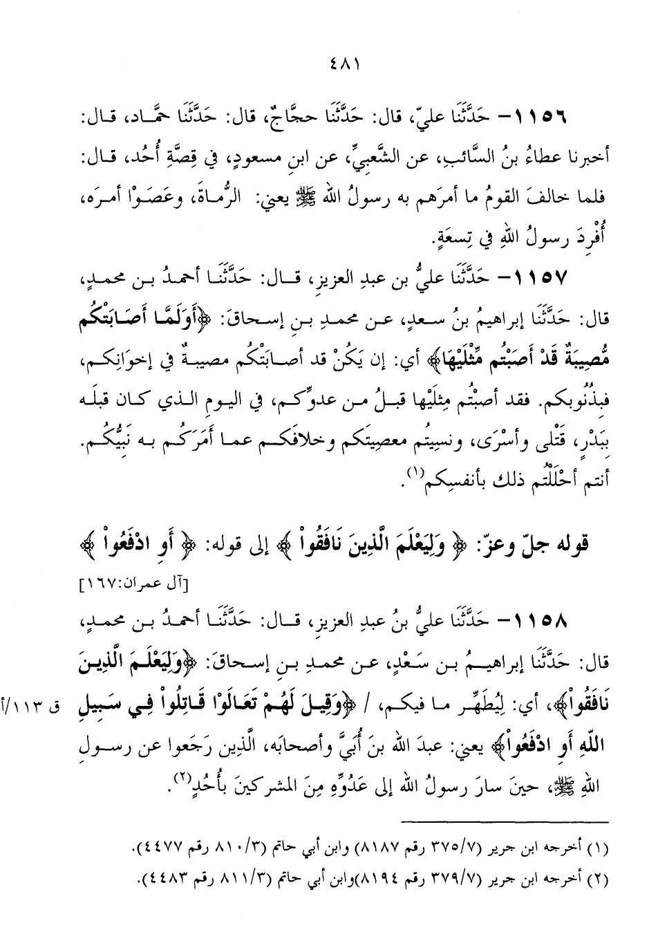 1158 - حَدَّثَنَا عَلِيُّ بْنُ عَبْدِ الْعَزِيزِ، قَالَ: حَدَّثَنَا أَحْمَدُ بْنُ مُحَمَّدٍ، قَالَ: حَدَّثَنَا إِبْرَاهِيمُ بْن سعد، عَنْ مُحَمَّد بْن إِسْحَاق " وَلِيَعْلَمَ الَّذِينَ نَافَقُوا، أي: ليطهر مَا فيكم، وَقِيلَ لَهُمْ تَعَالَوْا قَاتِلُوا فِي سَبِيلِ اللهِ أَوِ ادْفَعُوا يعني: عَبْد اللهِ بْن أبي وأصحابه، الَّذِينَ رجعوا عَنْ رَسُول اللهِ صَلَّى اللَّهُ عَلَيْهِ وَسَلَّمَ حين سار رَسُول اللهِ صَلَّى اللَّهُ عَلَيْهِ وَسَلَّمَ إِلَى عدوه من المشركين بأحد "