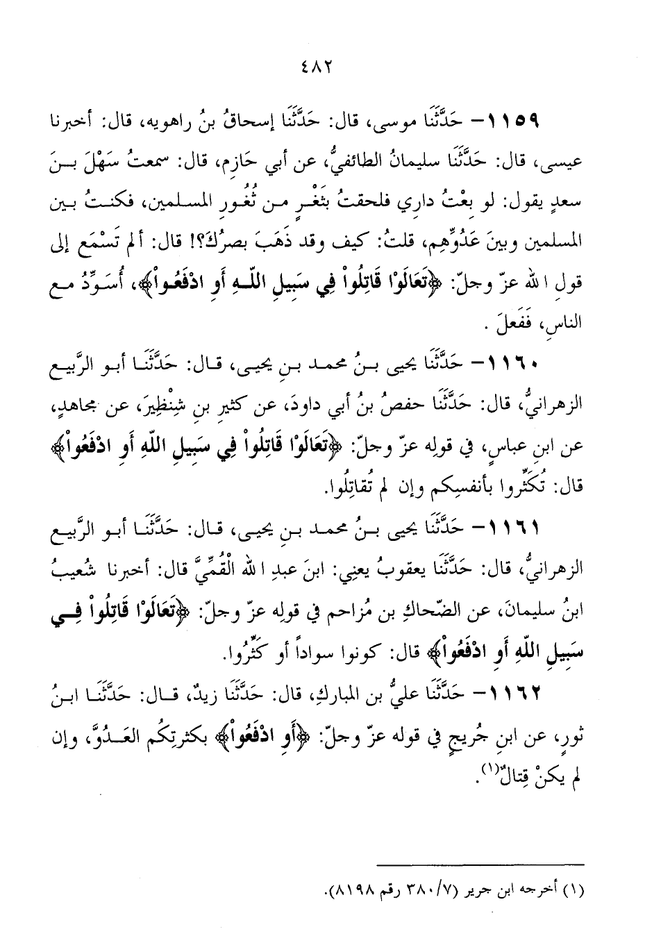 1161 - حَدَّثَنَا يَحْيَى بْنُ مُحَمَّدِ بْنِ يَحْيَى، قَالَ: حَدَّثَنَا أَبُو الرَّبِيعِ الزَّهْرَانِيُّ، قَالَ: حَدَّثَنَا يَعْقُوبُ يَعْنِي ابْنَ عَبْدِ اللهِ الْقُمِّيَّ، قَالَ: أَخْبَرَنَا شُعَيْبُ بْنُ سُلَيْمَانَ، عَنِ الضَّحَّاكِ بْنِ مُزَاحِمٍ فِي قوله عَزَّ وَجَلَّ " {تَعَالَوْا قَاتِلُوا فِي سَبِيلِ اللهِ أَوِ ادْفَعُوا} قَالَ: كُونُوا سَوَادًا أَوْ كَثِّرُوا "