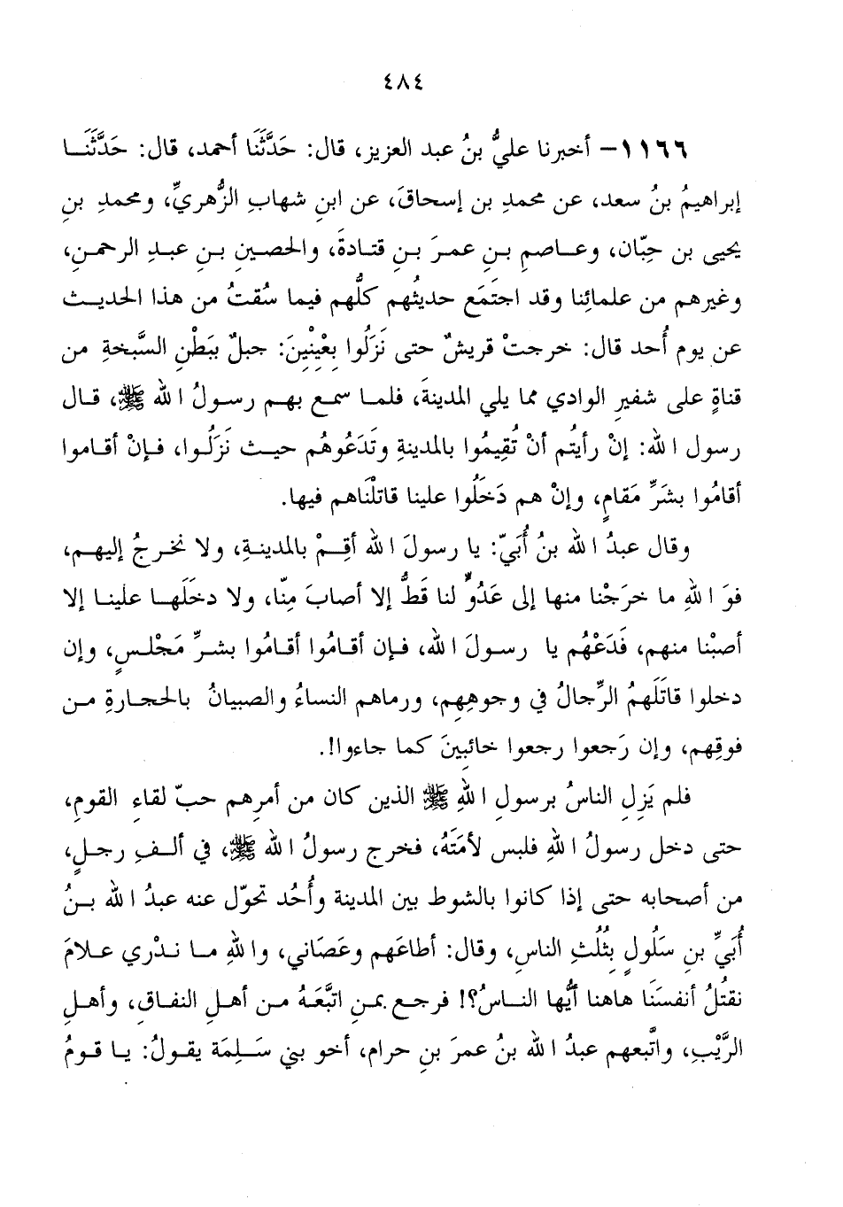 1166 - أَخْبَرَنَا عَلِيُّ بْنُ عَبْدِ الْعَزِيزِ، قَالَ: حَدَّثَنَا أَحْمَدُ، قَالَ: حَدَّثَنَا إِبْرَاهِيمُ بْنُ سَعْدٍ، عَنْ مُحَمَّدِ بْنِ إِسْحَاقَ، عَنِ ابْنِ شِهَابٍ الزُّهْرِيِّ، وَمُحَمَّدِ بْنِ يَحْيَى بْنِ حِبَّانَ، وَعَاصِمِ بْنِ عُمَرَ بْنِ قَتَادَةَ، وَالْحُصَيْنِ بْنِ عَبْدِ الرَّحْمَنِ، وَغَيْرِهِمْ مِنْ عُلَمَائِنَا وَقَدِ اجْتَمَعَ حَدِيثُهُمْ كُلِّهِمْ فِيمَا سُقْتُ مِنْ هَذَا الْحَدِيثِ عَنْ يَوْمِ أُحُدٍ قَالَ: خَرَجَتْ قُرَيْشٌ حَتَّى نَزَلُوا بِعَيْنَيْنِ: جَبَلٍ بِبَطْنِ السَّبَخَةِ مِنْ قَنَاةٍ عَلَى شَفِيرِ الْوَادِي مِمَّا يَلِي الْمَدِينَةَ، فَلَمَّا سَمِعَ بِهِمْ رَسُولُ اللهِ صَلَّى اللَّهُ عَلَيْهِ وَسَلَّمَ، قَالَ رَسُولُ اللهِ صَلَّى اللَّهُ عَلَيْهِ وَسَلَّمَ: " إِنْ رَأَيْتُمْ أَنْ تُقِيمُوا بِالْمَدِينَةِ وَتَدْعُوهُمْ حَيْثُ نَزَلُوا، فَإِنْ أَقَامُوا أَقَامُوا بِشَرِّ مَقَامٍ، وَإِنْ هُمْ دَخَلُوا عَلَيْنَا قَاتَلْنَاهُمْ فِيهَا " وَقَالَ عَبْد اللهِ بْن أبي: يَا رَسُولَ اللهِ أقم بالمدينة، ولا نخرج إليهم، فوالله مَا خرجنا منها إِلَى عدو لنا قط إِلا أصاب منا، ولا دخلها علينا إِلا أصبنا منهم، فدعهم يَا رَسُولَ اللهِ، فإن أقاموا أقاموا بشر مجلس، وإن دخلوا قاتلهم الرجال فِي وجوههم، ورماهم النساء والصبيان بالحجارة من فوقهم، وإن رجعوا رجعوا خائبين كما جاءوا فلم يزل الناس برسول الله صَلَّى اللَّهُ عَلَيْهِ وَسَلَّمَ الَّذِينَ كَانَ من أمرهم حب لقاء القوم، حَتَّى دخل رَسُول اللهِ فلبس لأمته، فخرج رَسُول اللهِ صَلَّى اللَّهُ عَلَيْهِ وَسَلَّمَ، فِي ألف رجل، من أصحابه حَتَّى إذا كَانُوا بالشوط بين المدينة وأحد تحول عنه عَبْد اللهِ بْن أبي بْن سلول بثلث الناس، وَقَالَ: أطاعهم وعصاني، والله مَا ندري علام نقتل أنفسنا هاهنا أيها الناس؟ فرجع بمن اتبعه من أهل النفاق، وأهل الريب، واتبعهم عَبْد اللهِ بْن عمر بْن حرام، أخو بني سلمة، يَقُول: يَا قوم