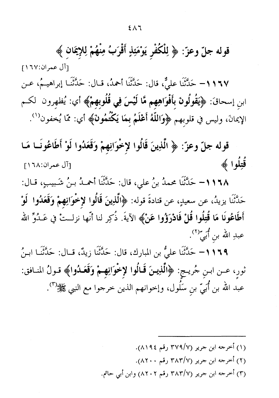 1167 - حَدَّثَنَا علي، قَالَ: حَدَّثَنَا أَحْمَدُ، قَالَ: حَدَّثَنَا إِبْرَاهِيمُ، عَنْ ابْن إسحاق " {يَقُولُونَ بِأَفْوَاهِهِمْ مَا لَيْسَ فِي قُلُوبِهِمْ} أي: يظهر لكم الإيمان، وليس فِي قلوبهم {وَاللهُ أَعْلَمُ بِمَا يَكْتُمُونَ} أي: مَا يخفون " قوله جَلَّ وَعَزَّ: {الَّذِينَ قَالُوا لإِخْوَانِهِمْ وَقَعَدُوا لَوْ أَطَاعُونَا مَا قُتِلُوا}