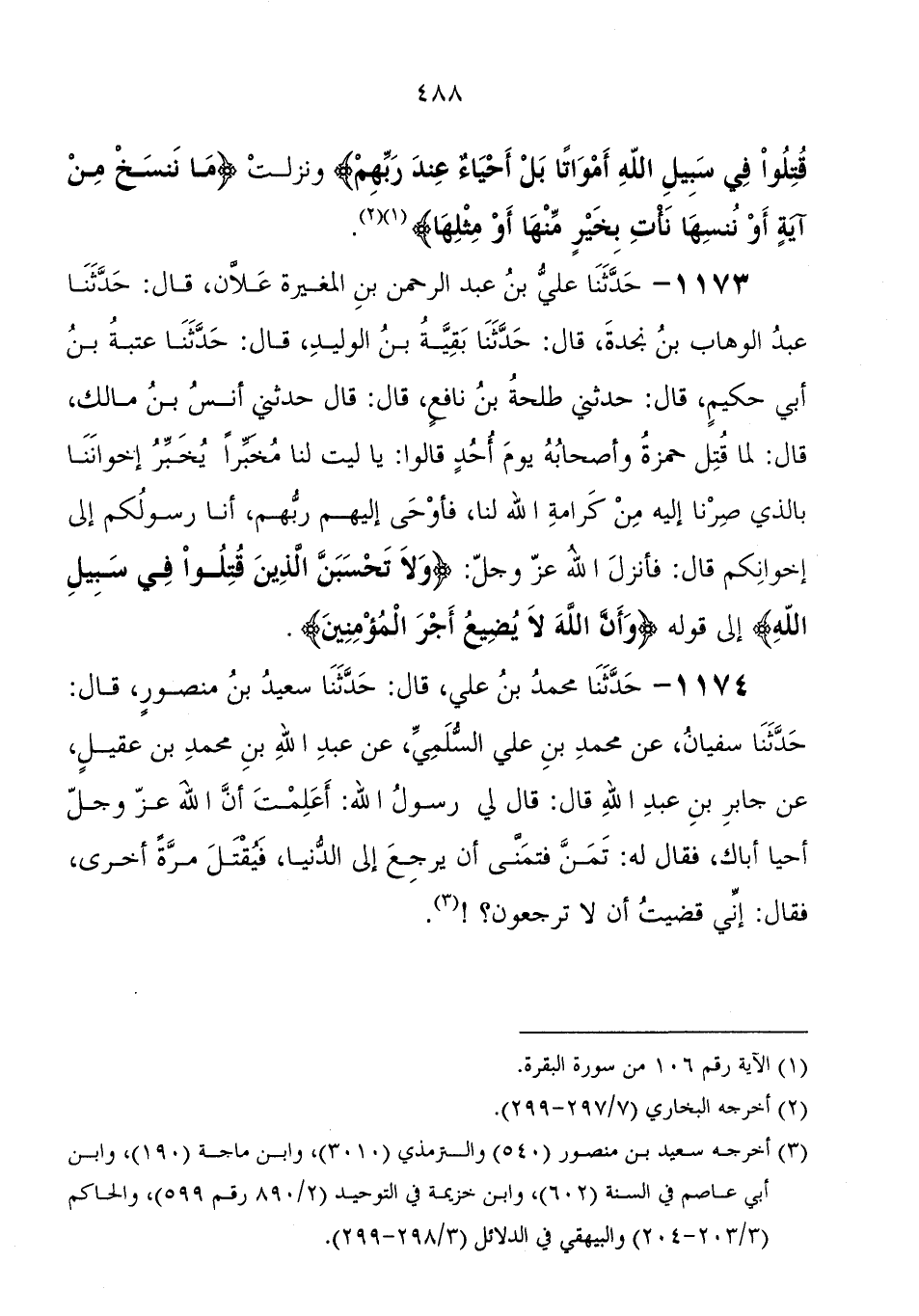 1173 - حَدَّثَنَا عَلِيُّ بْنُ عَبْدِ الرَّحْمَنِ بْنِ الْمُغِيرَةِ عَلانُ، قَالَ: حَدَّثَنَا عَبْدُ الْوَهَّابِ بْنُ نَجْدَةَ، قَالَ: حَدَّثَنَا بَقْيَةُ بْنُ الْوَلِيدِ، قَالَ: حَدَّثَنَا عُتْبَةُ بْنُ أَبِي حَكِيمٍ، قَالَ: حَدَّثَنِي طَلْحَةُ بْنُ نَافِعٍ، قَالَ: قَالَ حَدَّثَنِي أَنَسُ بْنُ مَالِكٍ، قَالَ: " لَمَّا قُتِلَ حَمْزَةُ وَأَصْحَابُهُ يَوْمَ أُحُدٌ قَالُوا: يَا لَيْتَ لَنَا مُخْبِرًا يُخْبِرُ إِخْوَانَنَا بِالَّذِي صِرْنَا إِلَيْهِ مِنْ كَرَامَةِ اللهِ لَنَا، فَأَوْحَى إِلَيْهِمْ رَبُّهُمْ، أَنَا رَسُولُكُمْ إِلَى إِخْوَانِكُمْ قَالَ: فَأَنْزَلَ اللهُ عَزَّ وَجَلَّ: {وَلا تَحْسَبَنَّ الَّذِينَ قُتِلُوا فِي سَبِيلِ اللهِ} إِلَى قوله: {وَأَنَّ اللهَ لا يُضِيعُ أَجْرَ الْمُؤْمِنِينَ} "
