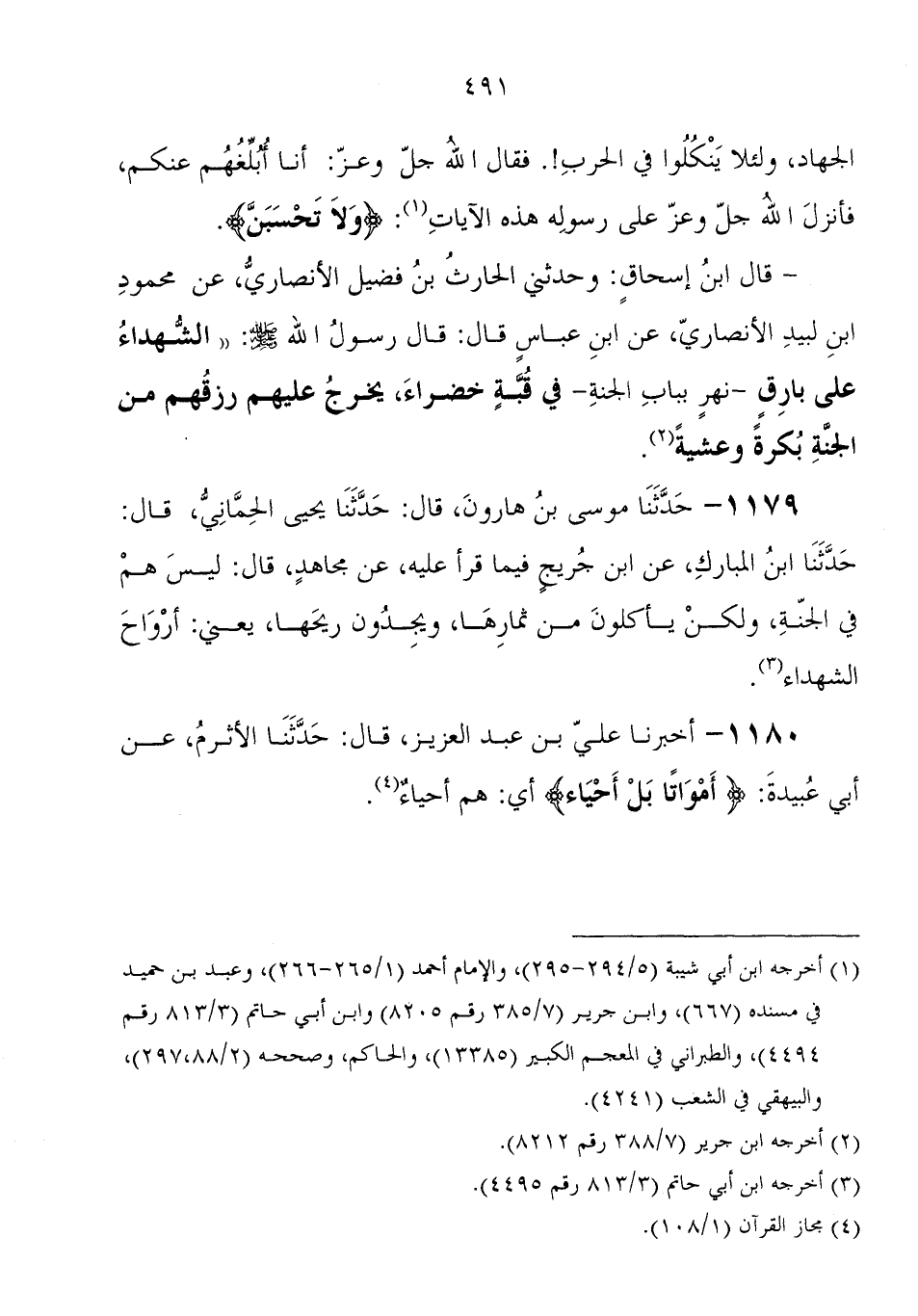 1179 - حَدَّثَنَا مُوسَى بْنُ هَارُونَ، قَالَ: حَدَّثَنَا يحيى الحماني، قَالَ: حَدَّثَنَا ابْنُ المبارك، عَنِ ابْنِ جُرَيْجٍ فيما قرأ عَلَيْهِ، عَنْ مجاهد، قَالَ " ليس هم فِي الجنة، ولكن يأكلون من ثمارها، ويجدون ريحها، يعني: أرواح الشهداء "
