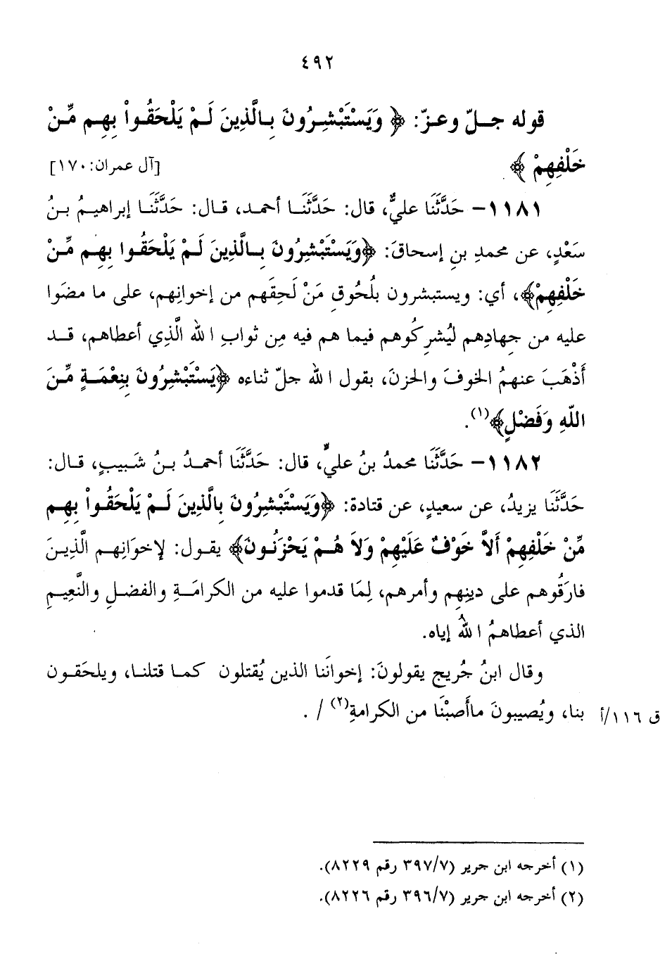 1181 - حَدَّثَنَا علي، قَالَ: حَدَّثَنَا أَحْمَدُ، قَالَ: حَدَّثَنَا إِبْرَاهِيمُ بْن سعد، عَنْ مُحَمَّد بْن إِسْحَاق " {وَيَسْتَبْشِرُونَ بِالَّذِينَ لَمْ يَلْحَقُوا بِهِمْ مِنْ خَلْفِهِمْ} ، أي: ويستبشرون بلحوق من لحقهم من إخوانهم، عَلَى مَا مضوا عَلَيْهِ من جهادهم ليشركوهم فيما هم فيه من ثواب الله الَّذِي أعطاهم، قد أذهب عنهم الخوف والحزن، بقول الله جل ثناءه {يَسْتَبْشِرُونَ بِنِعْمَةٍ مِنَ اللهِ وَفَضْلٍ} "