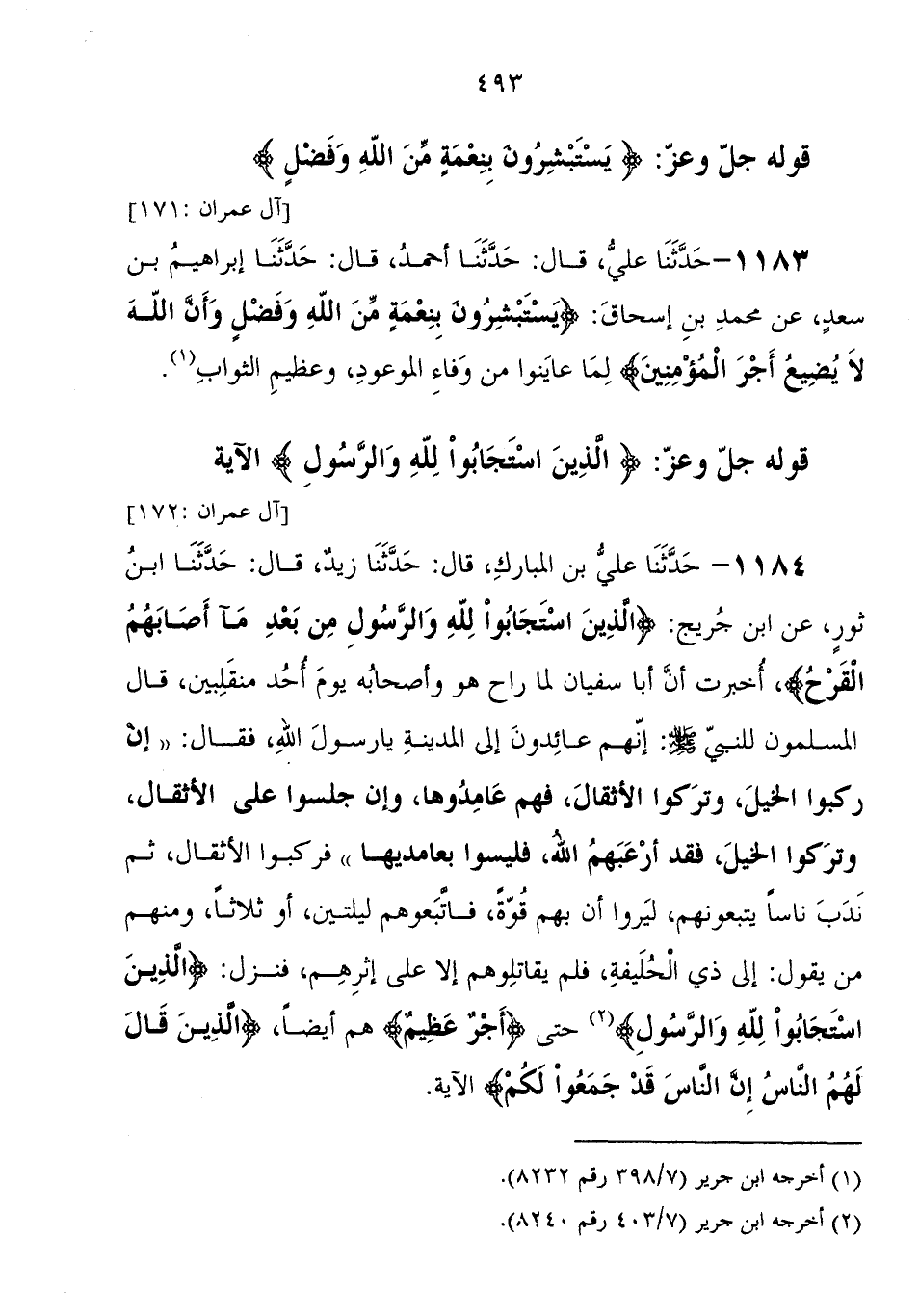 1183 - حَدَّثَنَا علي، قَالَ: حَدَّثَنَا أَحْمَدُ، قَالَ: حَدَّثَنَا إِبْرَاهِيمُ بْن سعد، عَنْ مُحَمَّد بْن إِسْحَاق " {يَسْتَبْشِرُونَ بِنِعْمَةٍ مِنَ اللهِ وَفَضْلٍ وَأَنَّ اللهَ لا يُضِيعُ أَجْرَ الْمُؤْمِنِينَ} لما عاينوا من وفاء الموعود، وعظيم الثواب " قوله جَلَّ وَعَزَّ: {الَّذِينَ اسْتَجَابُوا لِلَّهِ وَالرَّسُولِ} الآية