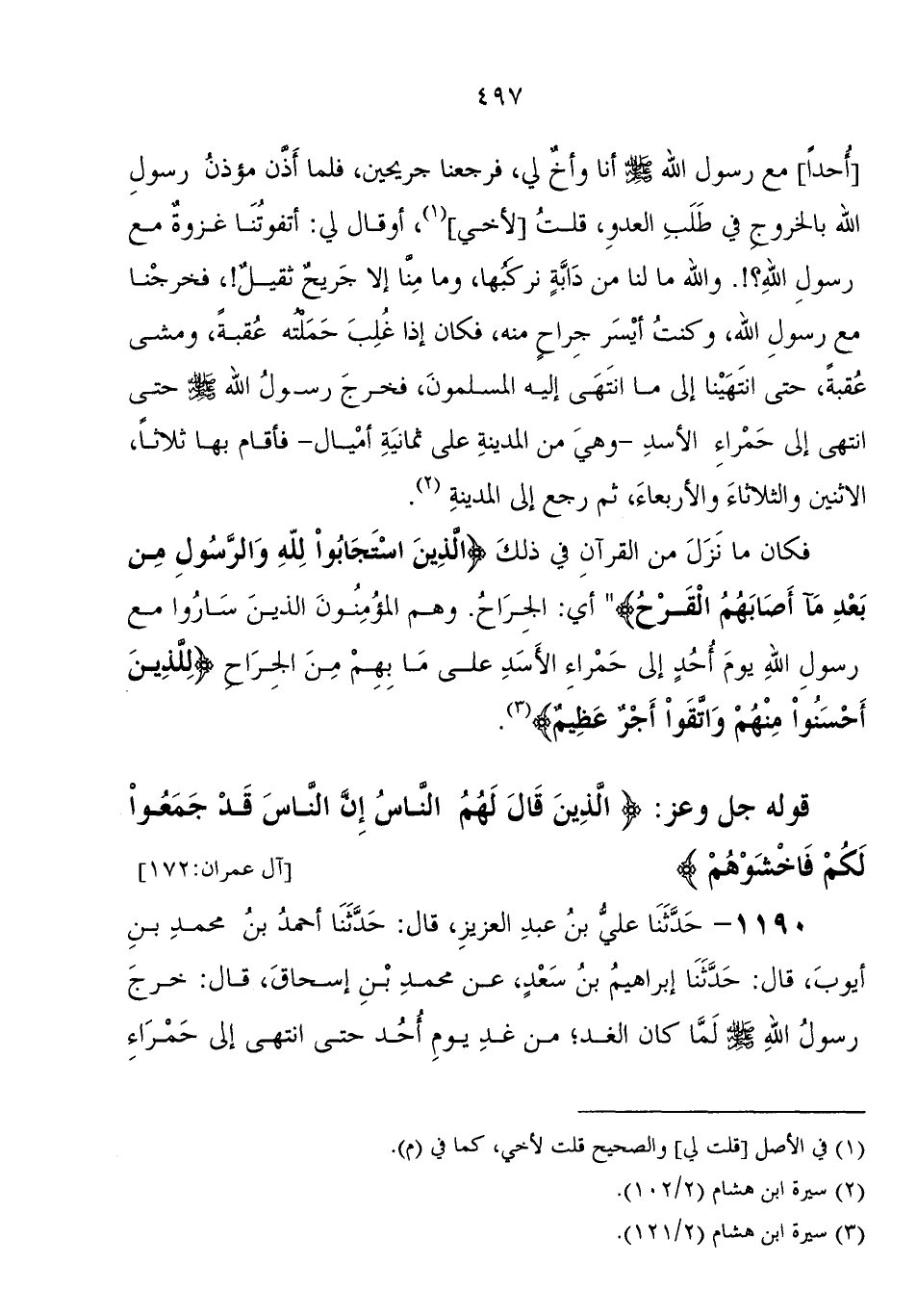 1190 - حَدَّثَنَا عَلِيُّ بْنُ عَبْدِ الْعَزِيزِ، قَالَ: حَدَّثَنَا أَحْمَدُ بْنُ مُحَمَّدِ بْنِ أَيُّوبَ، قَالَ: حَدَّثَنَا إِبْرَاهِيمُ بْنُ سَعْدٍ، عَنْ مُحَمَّدِ بْنِ إِسْحَاقَ، قَالَ: خَرَجَ رَسُولُ اللهِ صَلَّى اللَّهُ عَلَيْهِ وَسَلَّمَ لَمَّا كَانَ الْغَدُ، مِنْ غَدِ يَوْمِ أُحُدٍ حَتَّى انْتَهَى إِلَى حَمْرَاءِ