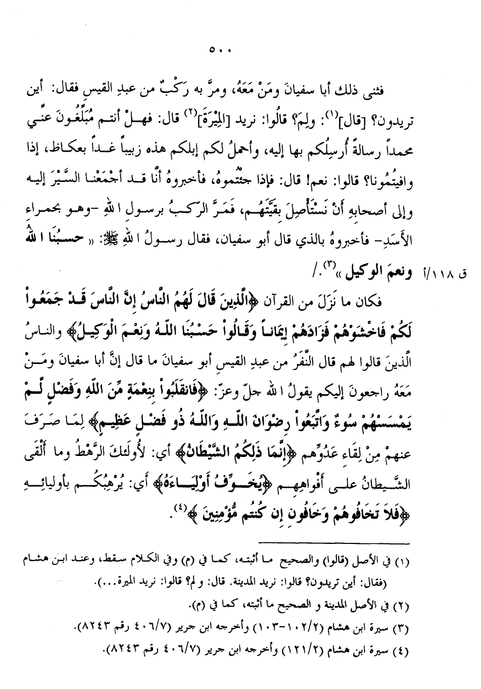 فَثَنَّى ذَلِكَ أَبَا سُفْيَانَ وَمَنْ مَعَهُ، وَمَرَّ بِهِ رَكْبٌ مِنْ عَبْدِ الْقَيْسِ فَقَالَ: أَيْنَ تُرِيدُونَ؟ قَالَ: وَلِمَ؟ قَالُوا: نُرِيدُ الْمِيَرَةَ، قَالَ: فَهَلْ أَنْتُمْ مُبْلِغُونَ عَنِّي مُحَمَّدًا رِسَالَةً أُرْسِلُكُمْ بِهَا إِلَيْهِ، وَأَحْمِلُ لَكُمْ إِبِلَكُمْ هَذِهِ زَبِيبًا غَدًا بِعُكَاظَ، إِذَا وَافَيْتُمُونَا؟ قَالُوا: نَعَمْ، قَالَ: فَإِذَا جِئْتُمُوهُ، فَأَخْبِرُوهُ أَنَّا قَدْ أَجْمَعْنَا السَّيْرَ إِلَيْهِ وَإِلَى أَصْحَابِهِ أَنْ نَسْتَأْصِلَ بَقِيَّتَهُمْ، فَمَرَّ الرَّكْبُ بِرَسُولِ اللهِ، وَهُوَ بِحَمْرَاءِ الأَسَدِ، فَأَخْبَرُوهُ بِالَّذِي قَالَ أَبُو سُفْيَانَ، فَقَالَ رَسُولُ اللهِ صَلَّى اللَّهُ عَلَيْهِ وَسَلَّمَ: " حَسْبُنَا اللهُ وَنِعْمَ الْوَكِيلُ " فَكَانَ مَا نَزَلَ مِنَ الْقُرْآنِ {الَّذِينَ قَالَ لَهُمُ النَّاسُ إِنَّ النَّاسَ قَدْ جَمَعُوا لَكُمْ فَاخْشَوْهُمْ فَزَادَهُمْ إِيمَانًا وَقَالُوا حَسْبُنَا اللهُ وَنِعْمَ الْوَكِيلُ} وَالنَّاسُ الَّذِينَ قَالُوا لَهُمْ قَالَ النَّفْرُ مِنْ عَبْدِ الْقَيْسِ أَبُو سُفْيَانَ مَا قَالَ إِنَّ أَبَا سُفْيَانَ وَمَنْ مَعَهُ رَاجِعُونَ إِلَيْكُمْ يَقُولُ اللهُ جَلَّ وَعَزَّ: {فَانْقَلَبُوا بِنِعْمَةٍ مِنَ اللهِ وَفَضْلٍ لَمْ يَمْسَسْهُمْ سُوءٌ وَاتَّبَعُوا رِضْوَانَ اللهِ وَاللهُ ذُو فَضْلٍ عَظِيمٍ} لِمَا صَرَفَ عَنْهُمْ مِنْ لِقَاءِ عَدُوِّهِمْ {إِنَّمَا ذَلِكُمُ الشَّيْطَانُ} أَيْ: لأُولَئِكَ الرَّهْطِ وَمَا أَلْقَى الشَّيْطَانُ عَلَى أَفْوَاهِهِمْ {يُخَوِّفُ أَوْلِيَاءَهُ} أَيْ: يُرْهِبَكُمْ بِأَوْلِيَائِهِ {فَلا تَخَافُوهُمْ وَخَافُونِ إِنْ كُنْتُمْ مُؤْمِنِينَ}
