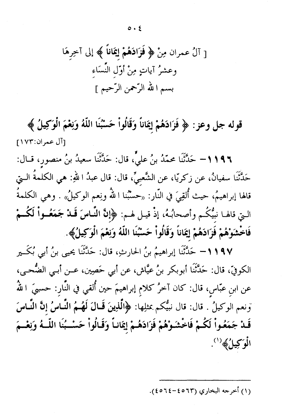 1197 - حَدَّثَنَا إِبْرَاهِيمُ بْنُ الْحَارِثِ، قَالَ: حَدَّثَنَا يَحْيَى بْنُ أَبِي بُكَيْرٍ الْكُوفِيُّ، قَالَ: حَدَّثَنَا أَبُو بَكْرِ بْنُ عَيَّاشٍ، عَنْ أَبِي حُصَيْنٍ، عَنْ أَبِي الضُّحَى، عَنِ ابْنِ عَبَّاسٍ، قَالَ: كَانَ آخِرُ كَلامِ إِبْرَاهِيمَ حِينَ أُلْقِيَ فِي النَّارِ " حَسْبِيَ اللهُ وَنِعْمَ الْوَكِيلُ " قَالَ: قَالَ نَبِيُّكُمْ بِمِثْلِهَا: {الَّذِينَ قَالَ لَهُمُ النَّاسُ إِنَّ النَّاسَ قَدْ جَمَعُوا لَكُمْ فَاخْشَوْهُمْ فَزَادَهُمْ إِيمَانًا وَقَالُوا حَسْبُنَا اللهُ وَنِعْمَ الْوَكِيلُ}