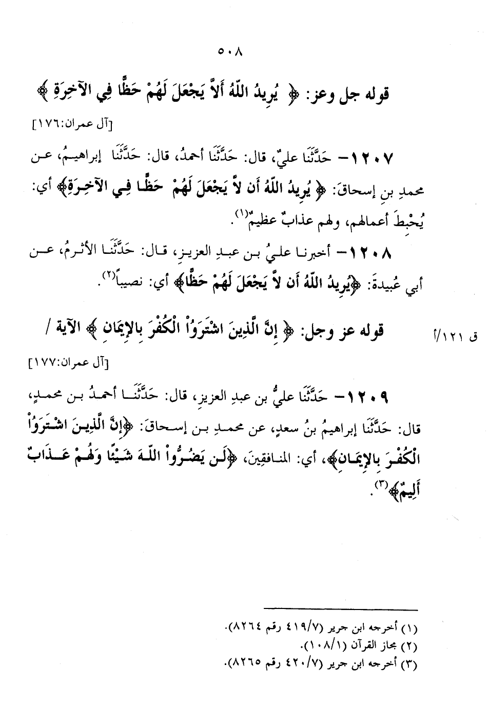 1209 - حَدَّثَنَا عَلِيُّ بْنُ عَبْدِ الْعَزِيزِ، قَالَ: حَدَّثَنَا أَحْمَدُ بْنُ مُحَمَّدٍ، قَالَ: حَدَّثَنَا إِبْرَاهِيمُ بْن سعد، عَنْ مُحَمَّد بْن إِسْحَاق " إِنَّ الَّذِينَ اشْتَرَوُا الْكُفْرَ بِالإِيمَانِ، أي المنافقين، لَنْ يَضُرُّوا اللهَ شَيْئًا وَلهُمْ عَذَابٌ أَلِيمٌ "
