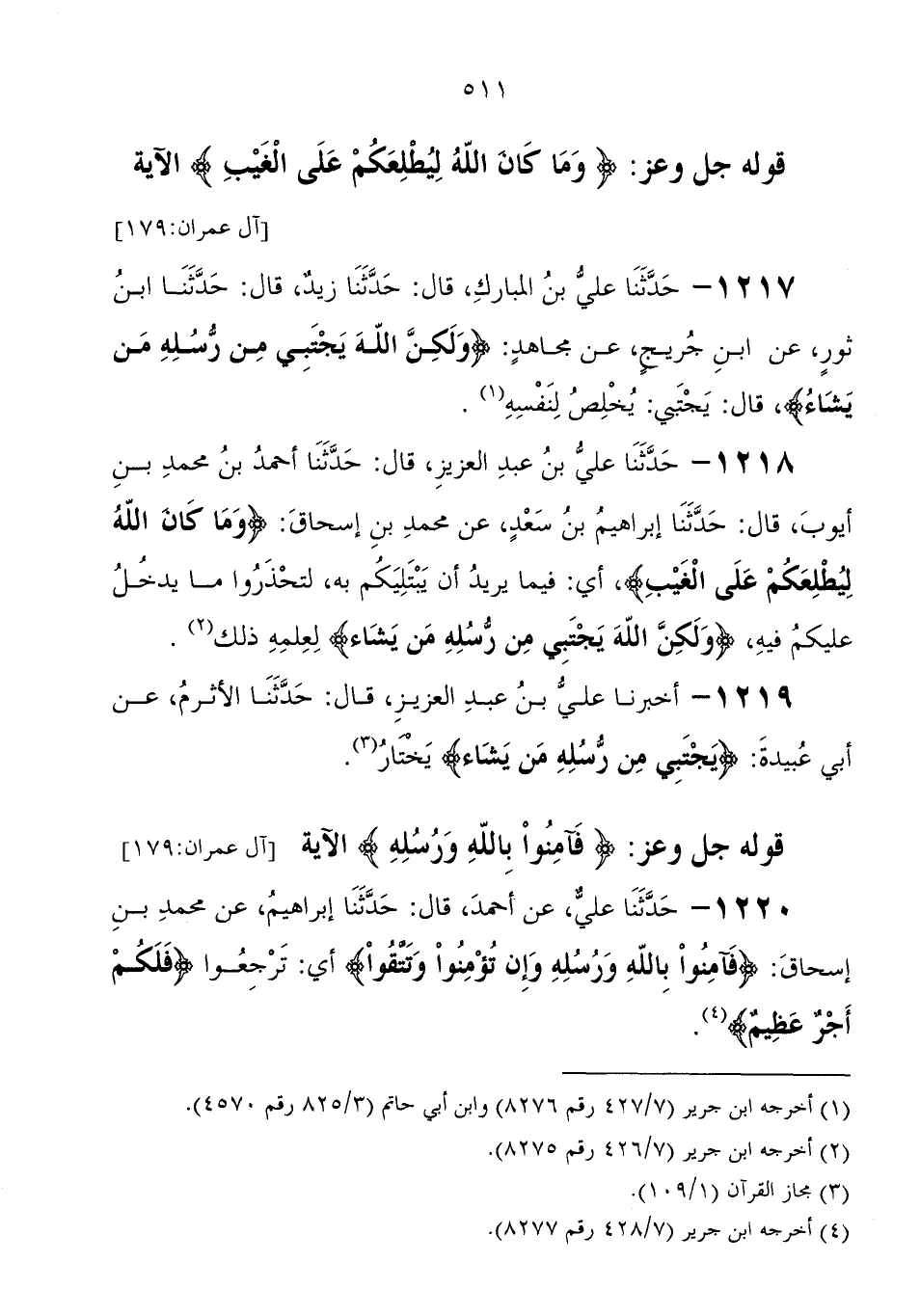 1219 - أَخْبَرَنَا علي بْن عَبْدِ العزيز، قَالَ: حَدَّثَنَا الأثرم، عَنْ أبي عبيدة: {يَجْتَبِي مِنْ رُسُلِهِ مَنْ يَشَاءُ} يختار " قوله جَلَّ وَعَزَّ: {فَآمِنُوا بِاللهِ وَرُسُلِهِ} الآية