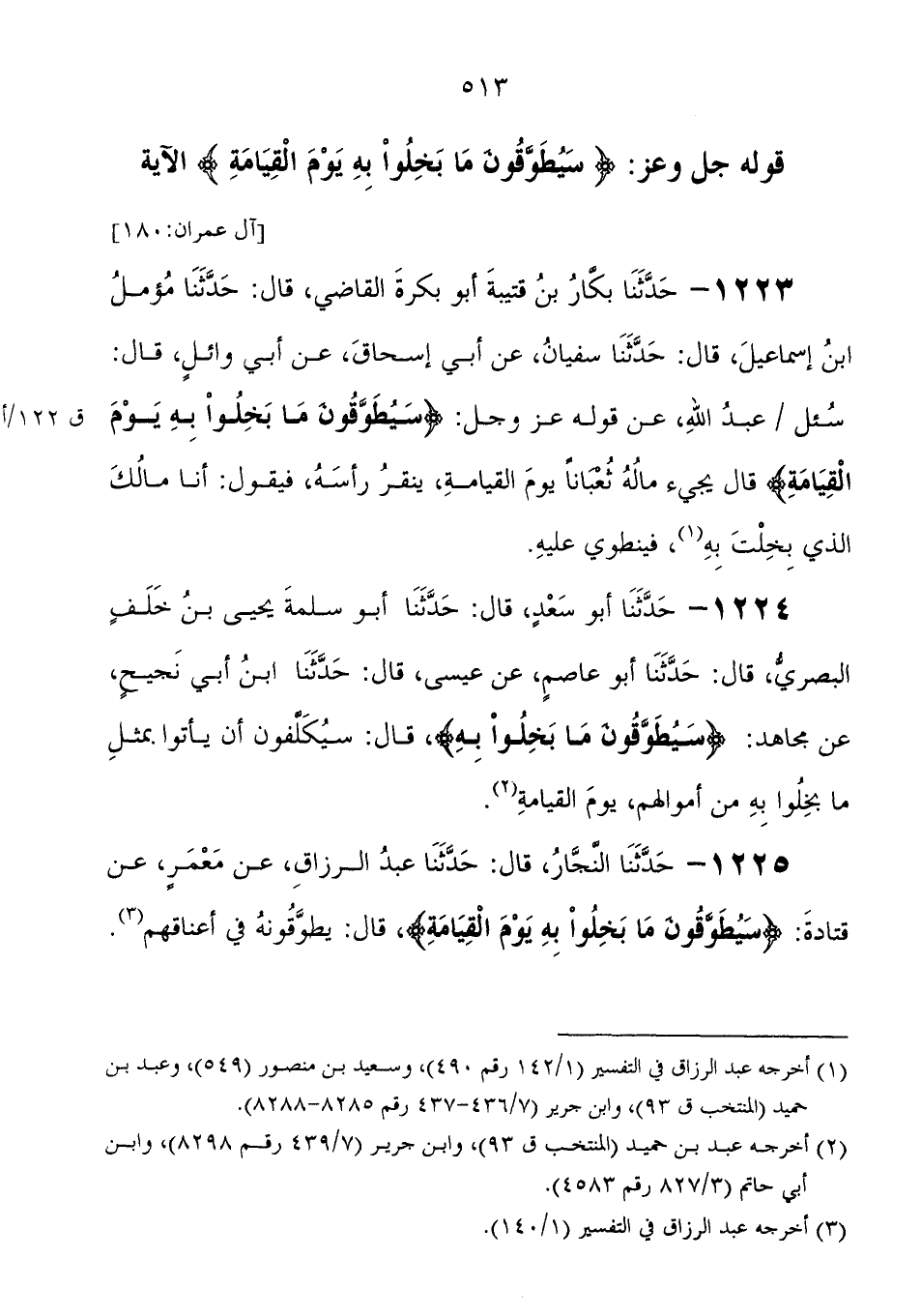 1225 - حَدَّثَنَا النجار، قَالَ: حَدَّثَنَا عَبْد الرزاق، عَنْ معمر، عَنْ قتادة " {سَيُطَوَّقُونَ مَا بَخِلُوا بِهِ يَوْمَ الْقِيَامَةِ} ، قَالَ: يطوقونه فِي أعناقهم "