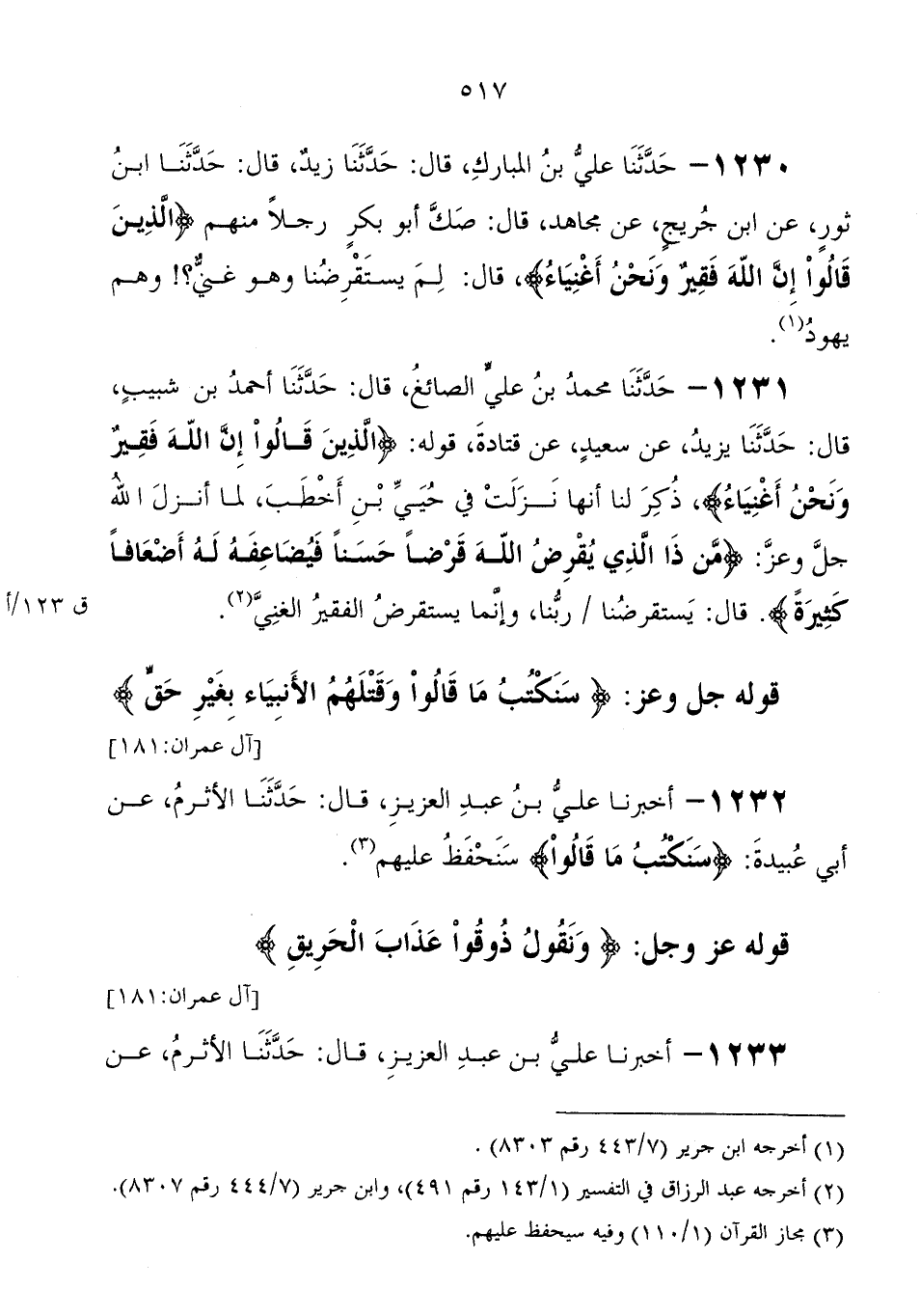 1230 - حَدَّثَنَا عَلِيُّ بْنُ الْمُبَارَكِ، قَالَ: حَدَّثَنَا زَيْدٌ، قَالَ: حَدَّثَنَا ابْنُ ثَوْرٍ، عَنِ ابْنِ جُرَيْجٍ، عَنْ مجاهد، قَالَ " صك أَبُو بكر رجلا منهم {الَّذِينَ قَالُوا إِنَّ اللهَ فَقِيرٌ وَنَحْنُ أَغْنِيَاءُ} ، قَالَ: لم يستقرضنا وَهُوَ غني؟ وهم يهود "