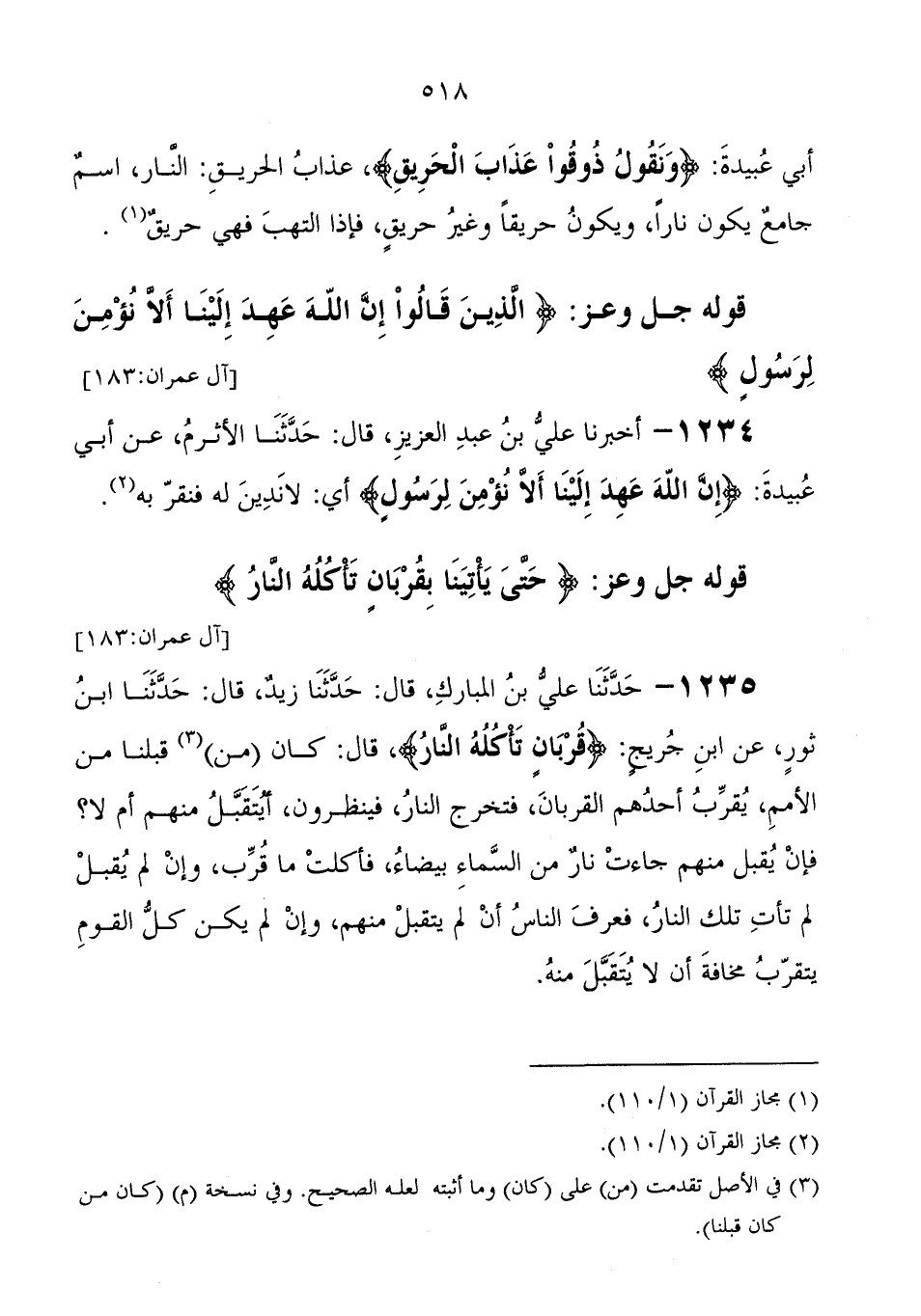 1234 - أخبرنا علي بن عبد العزيز، قال حدثنا الأثرم، عن أبي عبيدة " إِنَّ اللهَ عَهِدَ إِلَيْنَا أَلَّا نُؤْمِنَ لِرَسُولٍ أي: لا ندين له فنقر به "