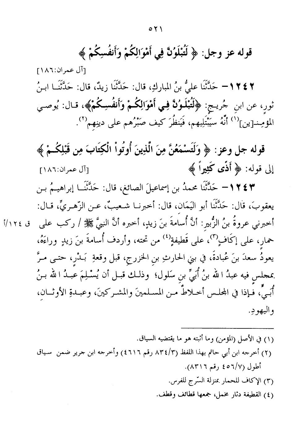 1242 - حَدَّثَنَا عَلِيُّ بْنُ الْمُبَارَكِ، قَالَ: حَدَّثَنَا زَيْدٌ، قَالَ: حَدَّثَنَا ابْنُ ثَوْرٍ، عَنْ ابْن جريج: " {لَتُبْلَوُنَّ فِي أَمْوَالِكُمْ وَأَنْفُسِكُمْ} ، قَالَ: يوصي المؤمنين أنه سيبتليهم، فينظر كيف صبرهم عَلَى دينهم " قوله جَلَّ وَعَزَّ: {وَلَتَسْمَعُنَّ مِنَ الَّذِينَ أُوتُوا الْكِتَابَ مِنْ قَبْلِكُمْ إِلَى قوله: أَذًى كَثِيرًا}
