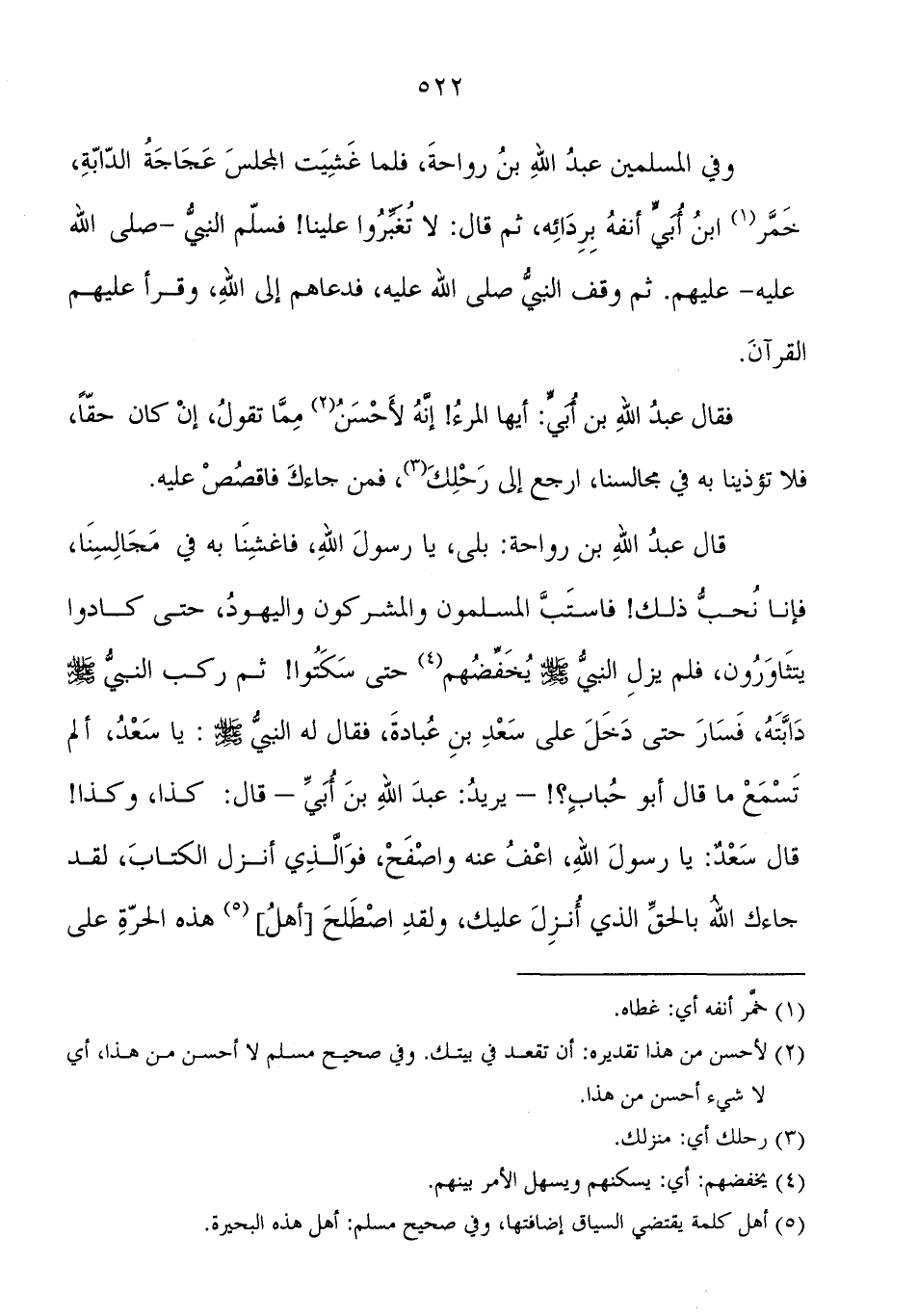 وَفِي الْمُسْلِمِينَ عَبْدُ اللهِ بْنُ رَوَاحَةَ، فَلَمَّا غَشِيَتِ الْمَجْلِسَ عَجَاجَةَ الدَّابَّةِ، خَمَرَ ابْنُ أُبَيٍّ أَنْفَهُ بِرِدَائِهِ، ثُمَّ قَالَ: لا تُغَبِّرُوا عَلَيْنَا، فَسَلَّمَ النَّبِيُّ صَلَّى اللَّهُ عَلَيْهِ وَسَلَّمَ عَلَيْهِمْ ثُمَّ وَقَفَ النَّبِيُّ صَلَّى اللَّهُ عَلَيْهِ وَسَلَّمَ، فَدَعَاهُمْ إِلَى اللهِ، وَقَرَأَ عَلَيْهِمُ الْقُرْآنَ فَقَالَ عَبْدُ اللهِ بْنُ أُبَيٍّ: أَيُّهَا الْمَرْءُ، إِنَّهُ لأَحْسَنُ مِمَّا تَقُولُ، إِنْ كَانَ حَقًّا، فَلا تُؤْذِينَا بِهِ فِي مَجَالِسِنَا، ارْجِعْ إِلَى رَحْلِكَ، فَمَنْ جَاءَكَ فَاقْصَصَّ عَلَيْهِ قَالَ عَبْدُ اللهِ بْنُ رَوَاحَةَ: بَلَى يَا رَسُولَ اللهِ، فَاغْشَنَا بِهِ فِي مَجَالِسِنَا، فَإِنَّا نُحِبُّ ذَلِكَ، فَاسْتَبَّ الْمُسْلِمُونَ وَالْمُشْرِكُونَ وَالْيَهُودُ حَتَّى كَادُوا يَتَثَاوَرُونَ، فَلَمْ يَزَلِ النَّبِيُّ صَلَّى اللَّهُ عَلَيْهِ وَسَلَّمَ يَخْفِضُهُمْ حَتَّى سَكَتُوا، ثُمَّ رَكِبَ النَّبِيُّ صَلَّى اللَّهُ عَلَيْهِ وَسَلَّمَ دَابَّتَهُ، فَسَارَ حَتَّى دَخَلَ عَلَى سَعْدِ بْنِ عُبَادَةَ، فَقَالَ النَّبِيُّ صَلَّى اللَّهُ عَلَيْهِ وَسَلَّمَ: " يَا سَعْدُ، أَلَمْ تَسْمَعْ مَا قَالَ أَبُو حُبَابٍ؟ يُرِيدُ: عَبْدَ اللهِ بْنَ أُبَيٍّ، قَالَ: كَذَا وَكَذَا "، قَالَ سَعْدٌ: يَا رَسُولَ اللهِ، اعْفُ عَنْهُ وَاصْفَحْ، فَوَالَّذِي أَنْزَلَ الْكِتَابَ، لَقَدْ جَاءَكَ اللهُ بِالْحَقِّ الَّذِي أُنْزِلَ عَلَيْكَ، وَلَقَدِ اصْطَلَحَ أَهْلُ هَذِهِ الْحَرَّةِ عَلَى