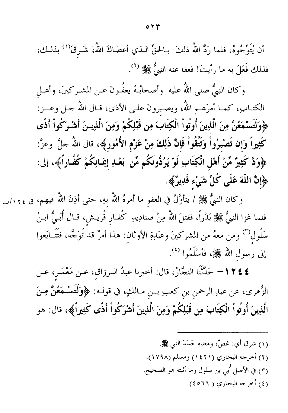 1244 - حَدَّثَنَا النجار، قَالَ: أَخْبَرَنَا عَبْد الرزاق، عَنْ معمر، عَنْ الزهري، عَنْ عَبْد الرَّحْمَنِ بْن كعب بْن مالك، فِي قوله " {وَلَتَسْمَعُنَّ مِنَ الَّذِينَ أُوتُوا الْكِتَابَ مِنْ قَبْلِكُمْ وَمِنَ الَّذِينَ أَشْرَكُوا أَذًى كَثِيرًا} ، قَالَ: هُوَ