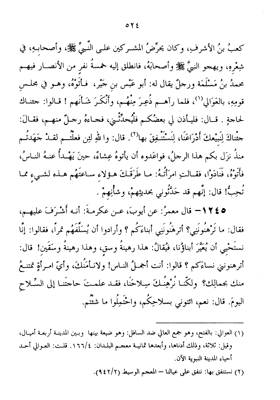 1245 - قَالَ مَعْمَرٌ عَنْ أَيُّوبَ، عَنْ عِكْرِمَةَ أَنَّهُ أَشْرَفَ عَلَيْهِمْ، فَقَالَ: مَا تَرْهَنُونَنِي؟ أَتَرْهَنُونَنِي أَبْنَاءَكُمْ؟ وَأَرَادُوا أَنْ يُسْلِفَهُمْ تَمْرًا، فَقَالُوا: إِنَّا نَسْتَحْيِي أَنْ يُعَيَّرَ أَبْنَاؤُنَا، فَيُقَالُ: هَذَا رَهِينَةُ وَسْقٍ، وَهَذَا رَهِينَةُ وَسْقَيْنِ، قَالَ: أَتَرْهَنُونَنِي نِسَاءَكُمْ؟ قَالُوا: أَنْتَ أَجْمَلُ النَّاسِ، وَلا نَأْمَنُكَ، وَأَيُّ امْرَأَةٍ تَمْتَنِعُ مِنْكَ بِجَمَالِكَ؟ وَلَكِنَّا نَرْهَنُكَ سِلاحَنَا، فَقَدْ عَلِمْتَ حَاجَتَنَا إِلَى السِّلاحِ الْيَوْمَ، قَالَ: نَعَمِ، ائْتُونِي بِسِلاحِكُمْ، وَاحْتَمِلُوا مَا شِئْتُمْ