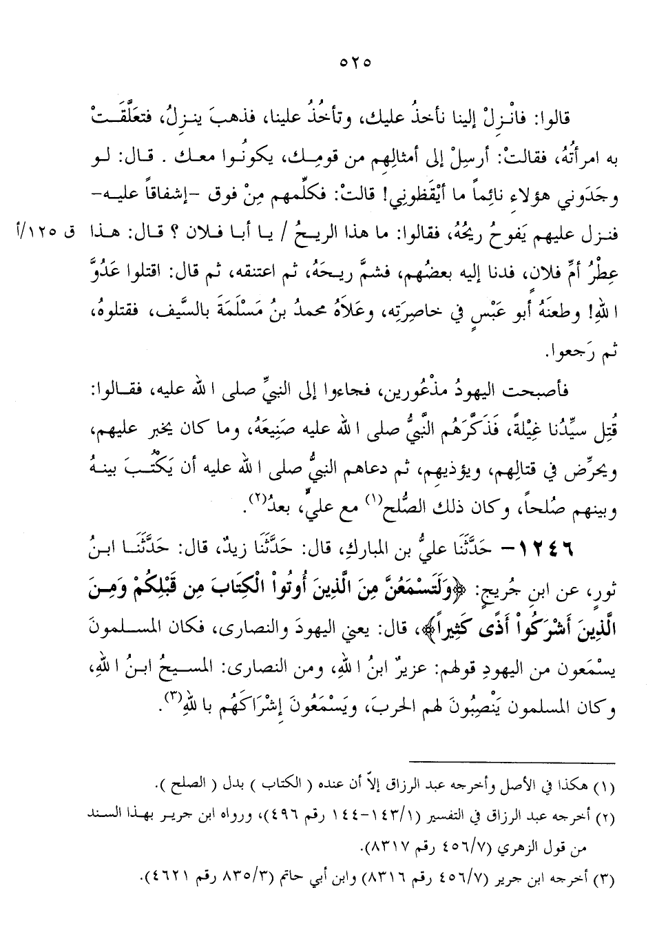 : حَدَّثَنَا ابْنُ ثَوْرٍ، عَنْ ابْن جريج: " {وَلَتَسْمَعُنَّ مِنَ الَّذِينَ أُوتُوا الْكِتَابَ مِنْ قَبْلِكُمْ وَمِنَ الَّذِينَ أَشْرَكُوا أَذًى كَثِيرًا} ، قَالَ: يعني اليهود والنصارى، فكان المسلمون يسمعون من اليهود قولهم: عزير ابْن الله، ومن النصارى: المسيح ابْن الله، وَكَانَ المسلمون ينصبون لهم الحرب، ويسمعون إشراكهم بِاللهِ "