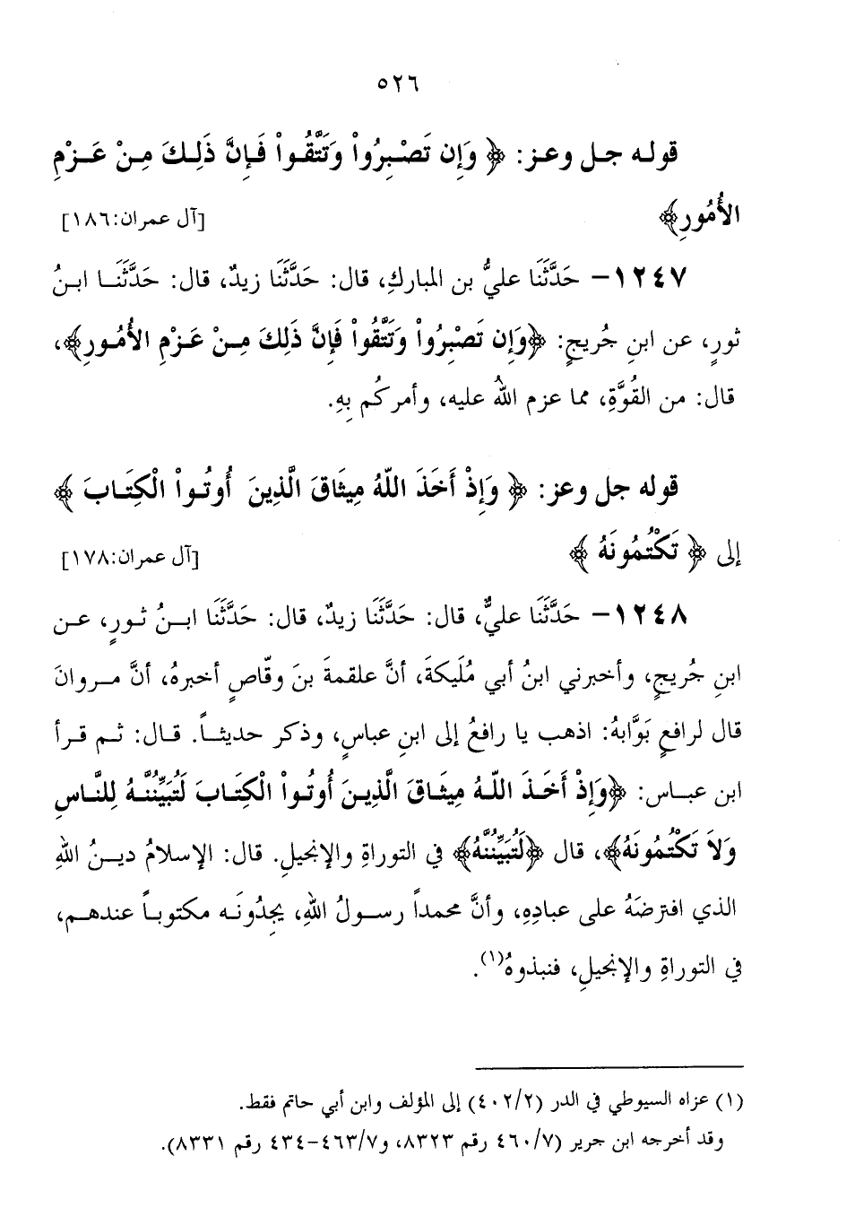 1247 - حَدَّثَنَا عَلِيُّ بْنُ الْمُبَارَكِ، قَالَ: حَدَّثَنَا زَيْدٌ، قَالَ: حَدَّثَنَا ابْنُ ثَوْرٍ، عَنِ ابْنِ جُرَيْجٍ " {وَإِنْ تَصْبِرُوا وَتَتَّقُوا فَإِنَّ ذَلِكَ مِنْ عَزْمِ الأُمُورِ} قَالَ: من القوة، مما عزم الله عَلَيْهِ وأمركم به " قوله جَلَّ وَعَزَّ: {وَإِذْ أَخَذَ اللهُ مِيثَاقَ الَّذِينَ أُوتُوا الْكِتَابَ إِلَى تَكْتُمُونَهُ}