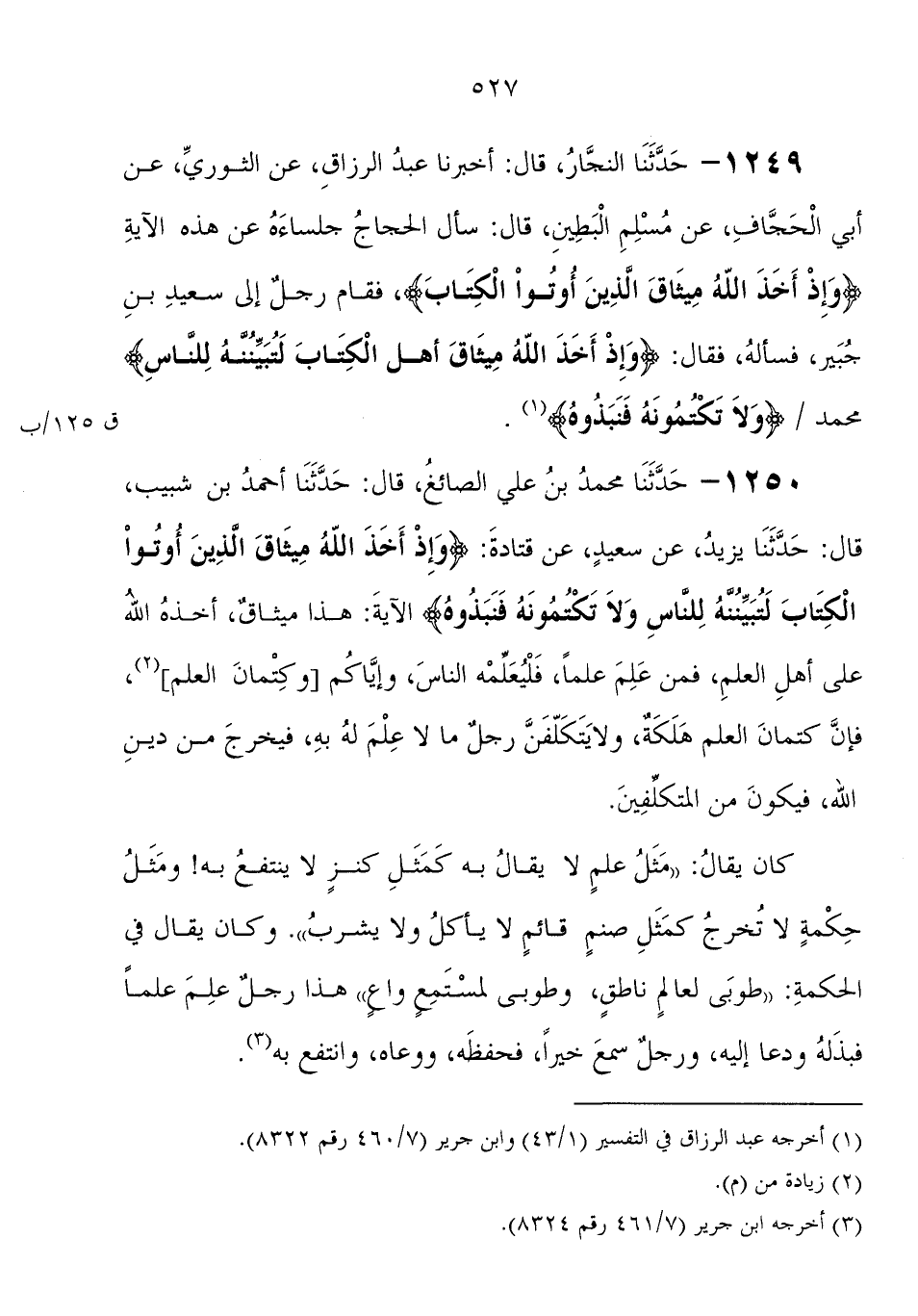 1250 - حَدَّثَنَا مُحَمَّدُ بْنُ عَلِيٍّ الصَّائِغُ، قَالَ: حَدَّثَنَا أَحْمَدُ بْنُ شبيب، قَالَ: حَدَّثَنَا يزيد، عَنْ سعيد، عَنْ قتادة " {وَإِذْ أَخَذَ اللهُ مِيثَاقَ الَّذِينَ أُوتُوا الْكِتَابَ لَتُبَيِّنُنَّهُ لِلنَّاسِ وَلا تَكْتُمُونَهُ فَنَبَذُوهُ} الآية: هَذَا ميثاق، أخذه الله عَلَى أهل العلم، فمن علم علما، فليعلمه الناس، وإياكم وكتمان العلم، فإن كتمان العلم هلكة، ولا يتكلفن رجل مَا لا علم له به، فيخرج من دين الله، فيكون من المتكلفين " كَانَ يقال: مثل علم لا يقال به كمثل كنز لا ينتفع به، ومثل حكمة لا تخرج كمثل صنم قائم لا يأكل ولا يشرب وَكَانَ يقال فِي الحكمة: طوبى لعالم ناطق، وطوبى لمستمع واع هَذَا رجل علم علما فبذله ودعا إِلَيْهِ، ورجل سمع خيرا، فحفظه، ووعاه، وانتفع به