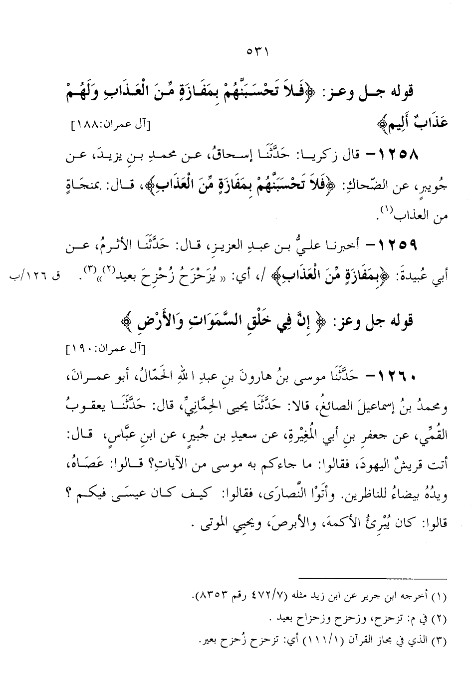 1259 - أَخْبَرَنَا علي بْن عَبْدِ العزيز، قَالَ: حَدَّثَنَا الأثرم، عَنْ أبي عبيدة " {بِمَفَازَةٍ مِنَ الْعَذَابِ} أي: يزحزح زحزح بعيد " قوله جَلَّ وَعَزَّ: {إِنَّ فِي خَلْقِ السَّمَوَاتِ وَالأَرْضِ}