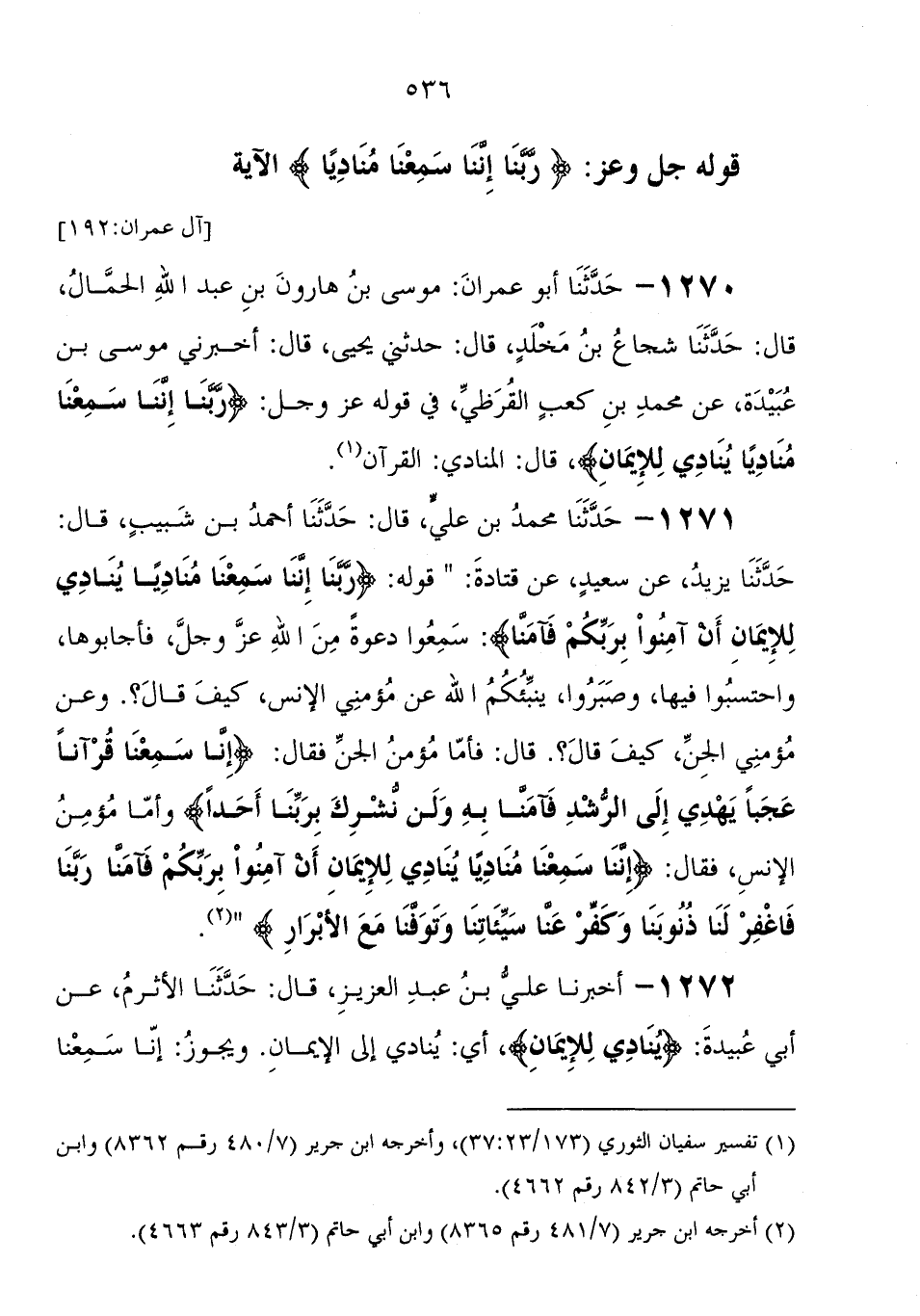 1271 - حَدَّثَنَا مُحَمَّد بْن علي، قَالَ: حَدَّثَنَا أَحْمَدُ بْنُ شبيب، قَالَ: حَدَّثَنَا يزيد، عَنْ سعيد، عَنْ قتادة، قوله " رَبَّنَا إِنَّنَا سَمِعْنَا مُنَادِيًا يُنَادِي لِلإِيمَانِ أَنْ آمِنُوا
