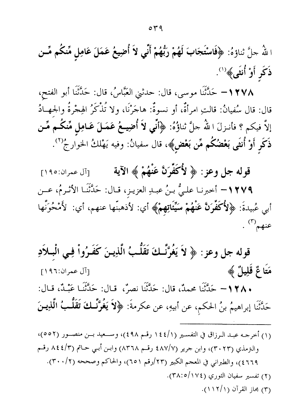 1278 - حَدَّثَنَا مُوسَى، قَالَ: حدثني العباس، قَالَ: حَدَّثَنَا أَبُو الفتح، قَالَ: قَالَ سُفْيَان " قالت امرأة، أو نسوة: هاجرنا، ولا تذكر الهجرة والجهاد إِلا فيكم؟ فأنزل الله جل ثناؤه: {أَنِّي لا أُضِيعُ عَمَلَ عَامِلٍ مِنْكُمْ مِنْ ذَكَرٍ أَوْ أُنْثَى بَعْضُكُمْ مِنْ بَعْضٍ} ، قَالَ سُفْيَان: وفيه يهلك الخوارج " قوله جَلَّ وَعَزَّ: {لأُكَفِّرَنَّ عَنْهُمْ} الآية