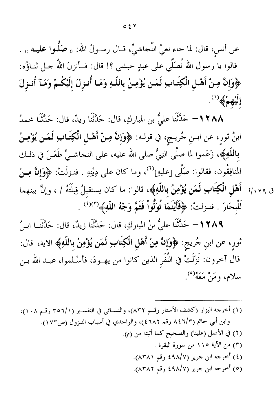 1288 - حَدَّثَنَا عَلِيُّ بْنُ الْمُبَارَكِ، قَالَ: حَدَّثَنَا زَيْدٌ، قَالَ: حَدَّثَنَا مُحَمَّدُ بْنُ ثَوْرٍ، عَنِ ابْنِ جُرَيْجٍ، فِي قوله " {وَإِنَّ مِنْ أَهْلِ الْكِتَابِ لَمَنْ يُؤْمِنُ بِاللهِ} ، زَعَمُوا لَمَّا صَلَّى النَّبِيُّ صَلَّى اللَّهُ عَلَيْهِ وَسَلَّمَ، عَلَى النَّجَاشِيِّ طَعَنَ فِي ذَلِكَ الْمُنَافِقُونَ، فَقَالُوا: صَلَّى عَلَيْهِ، وَمَا كَانَ عَلَى دِينِهِ فَنَزَلَتْ: {وَإِنَّ مِنْ أَهْلِ الْكِتَابِ لَمَنْ يُؤْمِنُ بِاللهِ} ، قَالُوا: مَا كَانَ يَسْتَقْبِلُ قِبْلَتَهُ، وَإِنَّ بَيْنَهُمَا لَلْبِحَارُ فَنَزَلَتْ: {فَأَيْنَمَا تُوَلُّوا فَثَمَّ وَجْهُ اللهِ} "