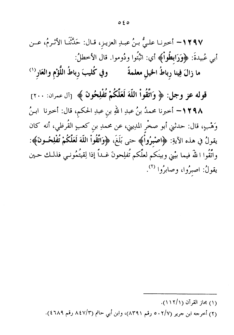 1297 - أَخْبَرَنَا علي بْن عَبْدِ العزيز، قَالَ: حَدَّثَنَا الأثرم، عَنْ أبي عبيدة " وَرَابِطُوا