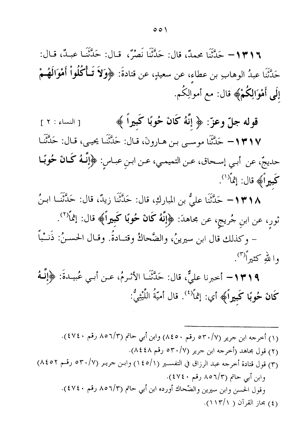 1318 - حَدَّثَنَا عَلِيُّ بْنُ الْمُبَارَكِ، قَالَ: حَدَّثَنَا زَيْدٌ، قَالَ: حَدَّثَنَا ابْنُ ثَوْرٍ، عَنِ ابْنِ جُرَيْجٍ، عَنْ مجاهد " {إِنَّهُ كَانَ حُوبًا كَبِيرًا} ، قَالَ: إثما " -- وَكَذَلِكَ قَالَ ابْنُ سِيرِينَ، وَالضَّحَّاكُ وَقَتَادَةُ وَقَالَ الْحَسَنُ: ذَنْبًا وَاللهِ كَثِيرًا