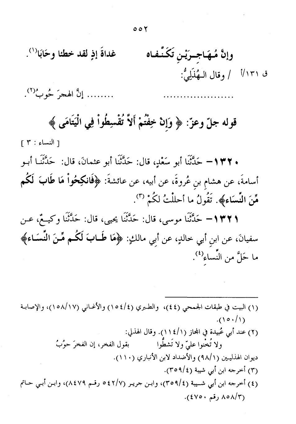 وإن مهاجرين تكنفاه غداة إذ لقد خطئا وحابا وَقَالَ الهذلي: إن الهجر حوب قوله جَلَّ وَعَزَّ: {وَإِنْ خِفْتُمْ أَلَّا تُقْسِطُوا فِي الْيَتَامَى}