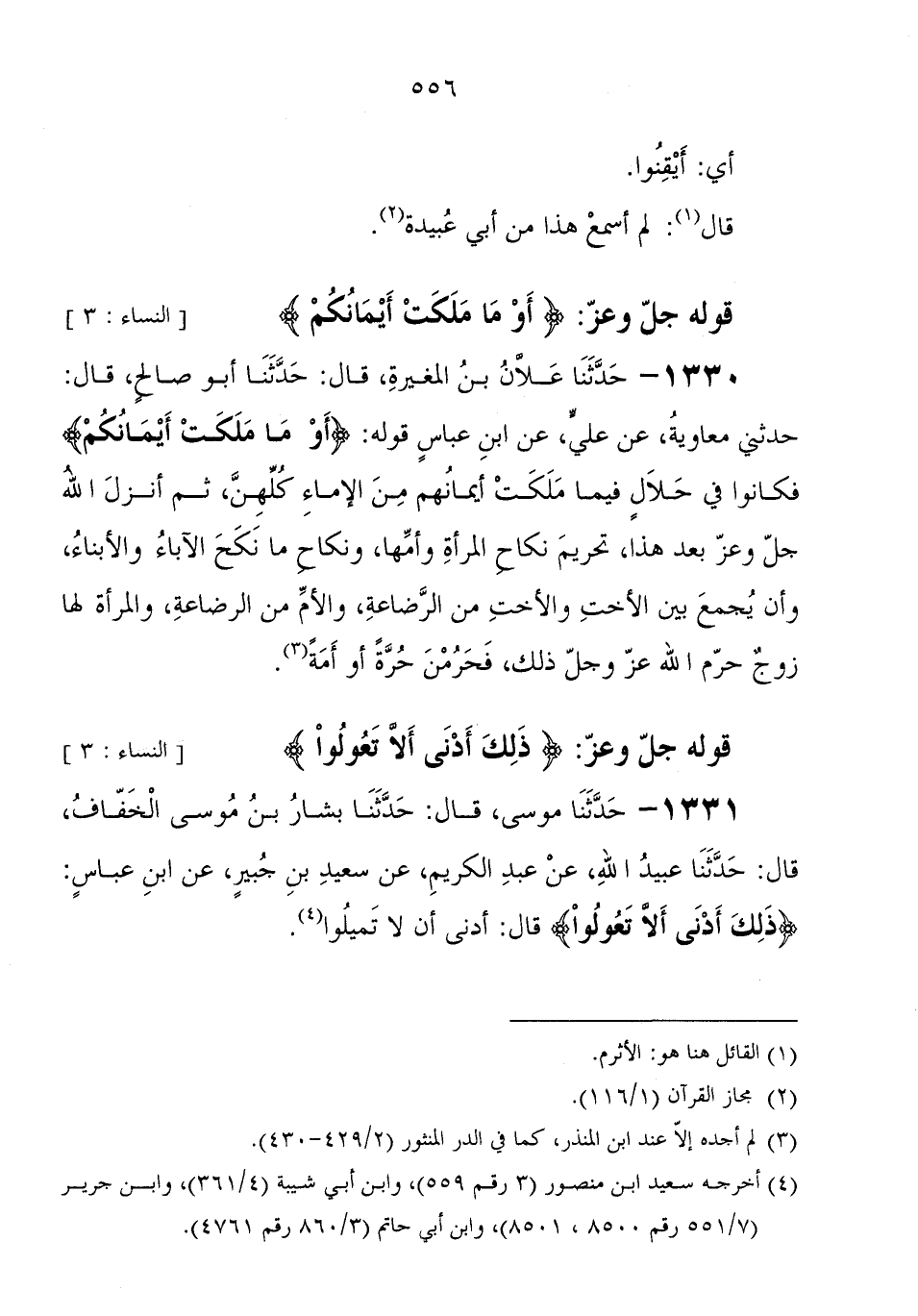 1331 - حَدَّثَنَا مُوسَى، قَالَ: حَدَّثَنَا بَشَّارُ بْنُ مُوسَى الْخَفَّافُ، قَالَ: حَدَّثَنَا عُبَيْدُ اللهِ، عَنْ عَبْدِ الْكَرِيمِ، عَنْ سَعِيدِ بْنِ جُبَيْرٍ، عَنِ ابْنِ عَبَّاسٍ " {ذَلِكَ أَدْنَى أَلَّا تَعُولُوا} قَالَ: أَدْنَى أَنْ لا تَمِيلُوا "