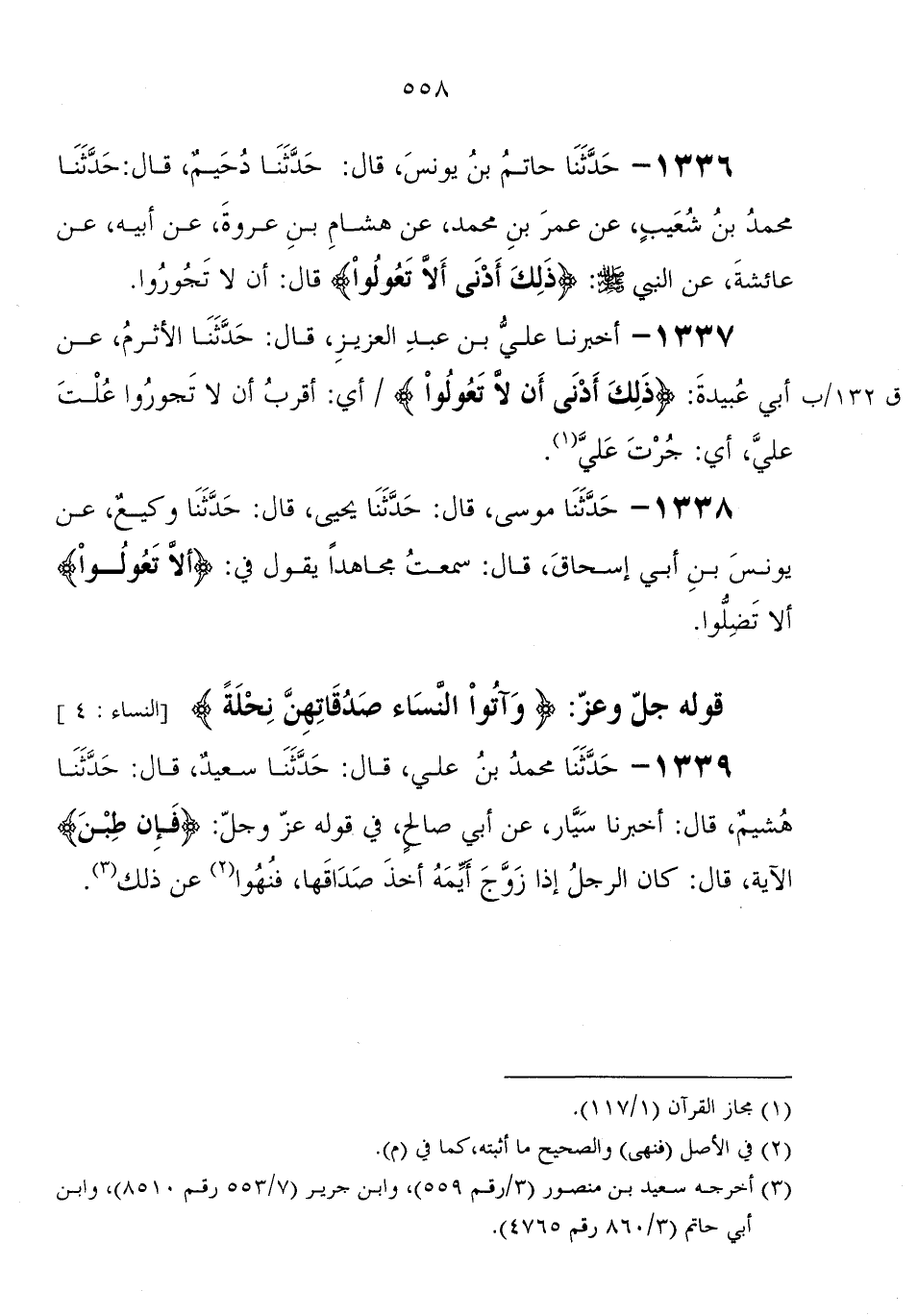 1336 - حَدَّثَنَا حَاتِمُ بْنُ يُونُسَ، قَالَ: حَدَّثَنَا دُحَيْمٌ، قَالَ: حَدَّثَنَا مُحَمَّدُ بْنُ شُعَيْبٍ، عَنْ عُمَرَ بْنِ مُحَمَّدٍ، عَنْ هِشَامِ بْنِ عُرْوَةَ، عَنْ أَبِيهِ، عَنْ عَائِشَةَ، عَنِ النَّبِيِّ صَلَّى اللَّهُ عَلَيْهِ وَسَلَّمَ: " {ذَلِكَ أَدْنَى أَلَّا تَعُولُوا} قَالَ: أَنْ لا تَجُورُوا "