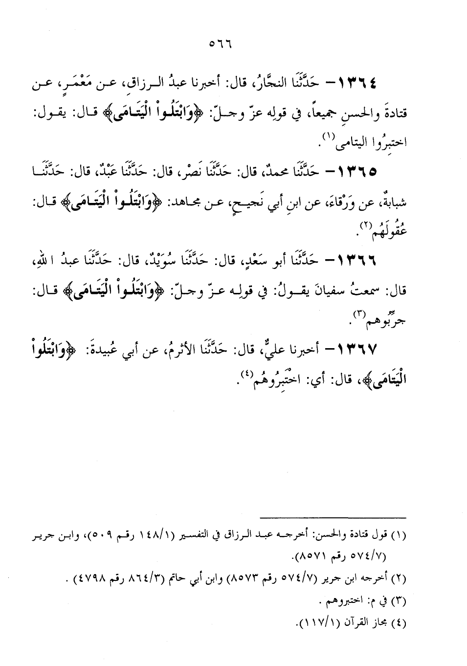 1364 - حَدَّثَنَا النجار، قَالَ: أَخْبَرَنَا عَبْد الرزاق، عَنْ معمر، عَنْ قتادة والحسن جميعا، فِي قوله عَزَّ وَجَلَّ " {وَابْتَلُوا الْيَتَامَى} قَالَ: يَقُول: اختبروا اليتامى "