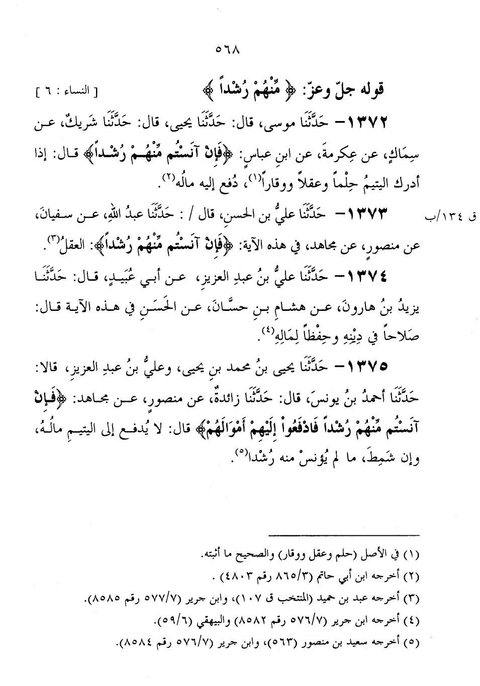 1375 - حَدَّثَنَا يَحْيَى بْن مُحَمَّد بْن يَحْيَى، وعلي بْن عَبْدِ العزيز، قالا: حَدَّثَنَا أحمد بْن يونس، قَالَ: حَدَّثَنَا زائدة، عَنْ منصور، عَنْ مجاهد " {فَإِنْ آنَسْتُمْ مِنْهُمْ رُشْدًا فَادْفَعُوا إِلَيْهِمْ أَمْوَالَهُمْ} قَالَ: " لا يدفع إِلَى اليتيم ماله، وإن شمط، مَا لم يؤنس منه رشدا "