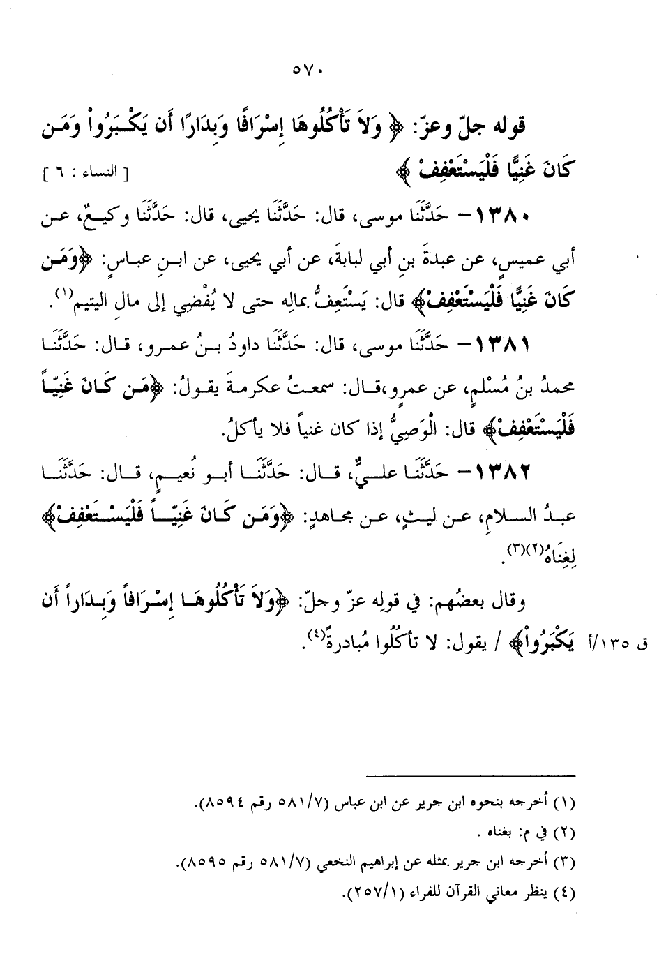1381 - حَدَّثَنَا مُوسَى، قَالَ: حَدَّثَنَا داود بْن عمرو، قَالَ: حَدَّثَنَا مُحَمَّد بْن مسلم، عَنْ عمرو، قَالَ: سمعت عكرمة، يَقُول: " {وَمَنْ كَانَ غَنِيًّا فَلْيَسْتَعْفِفْ} قَالَ: الوصي إذا كَانَ غنيا فلا يأكل "