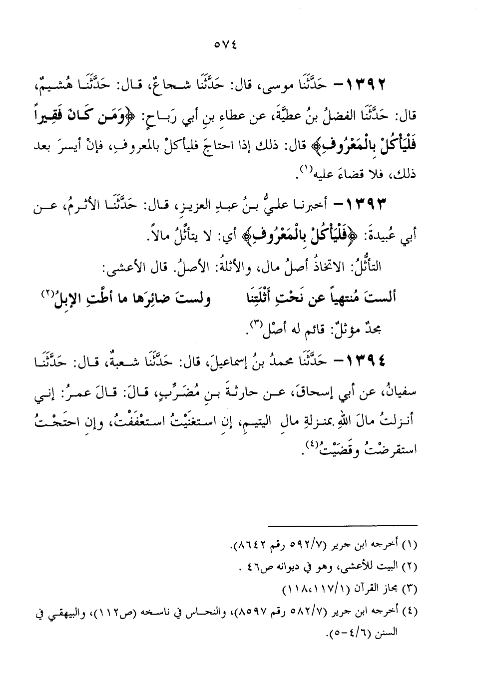 1393 - أَخْبَرَنَا علي بْن عَبْدِ العزيز، قَالَ: حَدَّثَنَا الأثرم، عَنْ أبي عبيدة " {فَلْيَأْكُلْ بِالْمَعْرُوفِ} أي: لا يتأثل مالا " التأثل: الاتخاذ أصل مال، والأثلة: الأصل قَالَ الأعشى