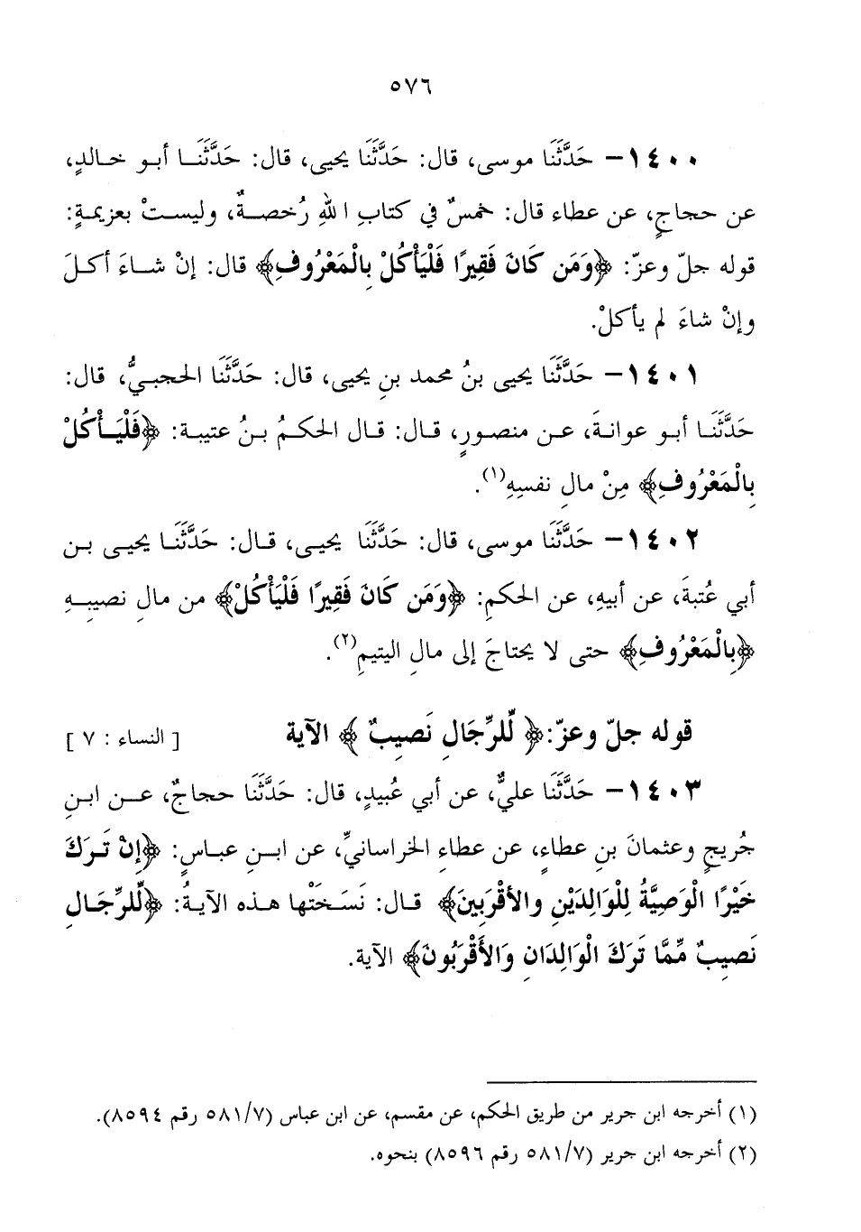 1402 - حَدَّثَنَا مُوسَى، قَالَ: حَدَّثَنَا يَحْيَى، قَالَ: حَدَّثَنَا يَحْيَى بْن أبي عتبة، عَنْ أبيه، عَنْ الحكم " {وَمَنْ كَانَ فَقِيرًا فَلْيَأْكُلْ} من مال نصيبه {بِالْمَعْرُوفِ} حَتَّى لا يحتاج إِلَى مال اليتيم "