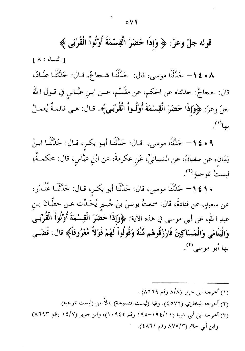1410 - حَدَّثَنَا مُوسَى، قَالَ: حَدَّثَنَا أَبُو بَكْرٍ، قَالَ: حَدَّثَنَا غُنْدُرٌ، عَنْ سَعِيدٍ، عَنْ قَتَادَةَ، قَالَ: سَمِعْتُ يُونُسَ بْنَ جُبَيْرٍ، يُحَدِّثُ عَنْ حِطَّانَ بْنِ عَبْدِ اللهِ، عَنْ أَبِي مُوسَى فِي هَذِهِ الآيَةِ " {وَإِذَا حَضَرَ الْقِسْمَةَ أُولُو الْقُرْبَى وَالْيَتَامَى وَالْمَسَاكِينُ فَارْزُقُوهُمْ مِنْهُ وَقُولُوا لَهُمْ قَوْلا مَعْرُوفًا} قَالَ: قَضَى بِهَا أَبُو مُوسَى "