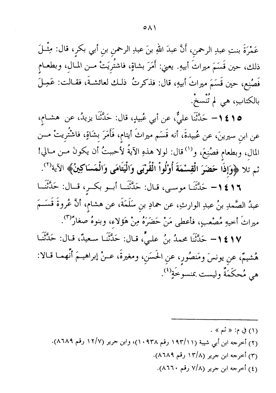 عمرة بنت عَبْد الرَّحْمَنِ، أن عَبْد اللهِ بْن عَبْدِ الرَّحْمَنِ بْن أبي بكر، قَالَ مثل ذَلِكَ، حين قسم ميراث أبيه يعني: أمر بشاة، فاشتريت من المال، وبطعام فصنع، حين قسم ميراث أبيه، قَالَ: فذكرت ذَلِكَ لعائشة، فقالت: عمل بالكتاب، هي لم تنسخ "